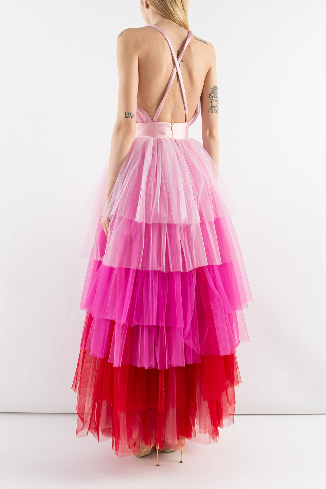 DORIS S dress in degrade tulle with flounces, thin straps and v-neck, satin band at the waist. Invisible zip closure on the back.