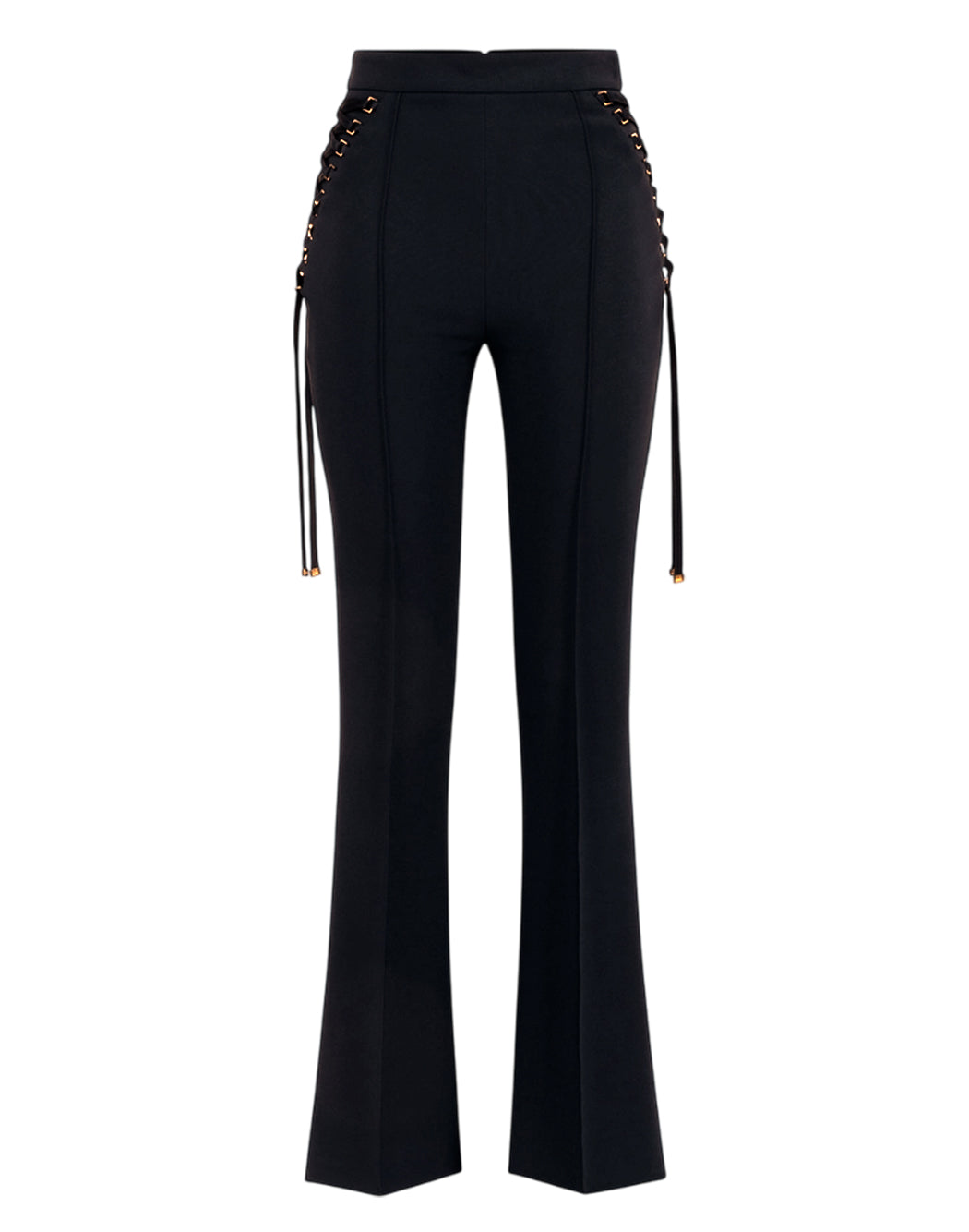 Refined silhouette for these Elisabetta Franchi flared trousers that balance the volumes with a high waist that elegantly marks the silhouette. Made of polyester crêpe with a small percentage of elastane to ensure a comfortable and slim fit, the design is characterized by crisscrossed laces on the sides, which pass through square rings and end with golden metal tips. Perfect for feminine looks with a touch of originality, including formal outfits.