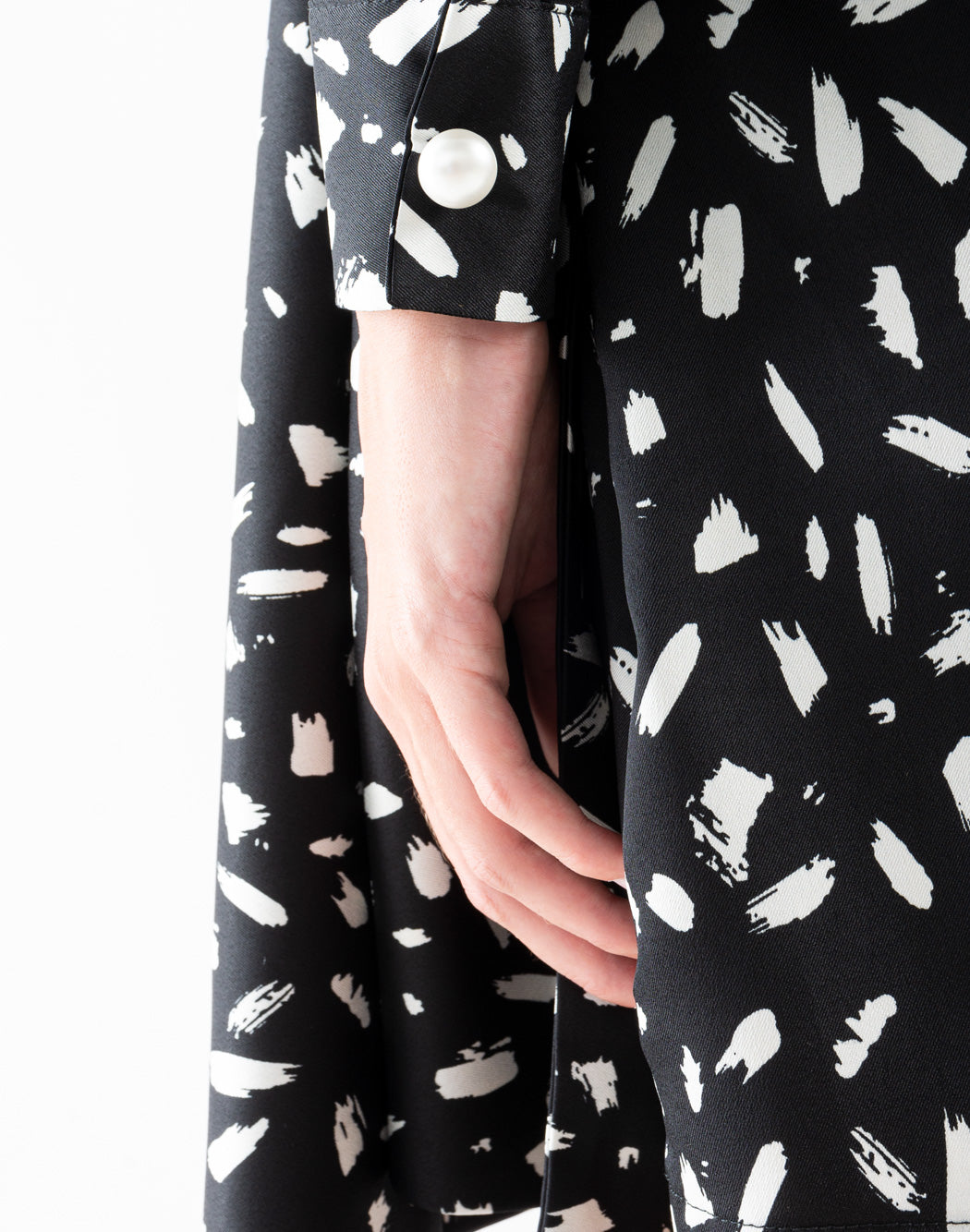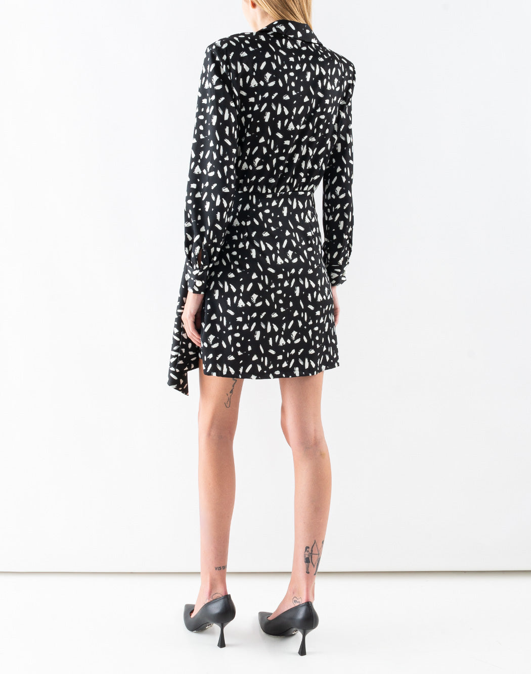 DORIS S dress with two-tone print, padded shoulder straps with collar and v-neck, long sleeves and sash to tie on the side. Invisible zip closure on the side.