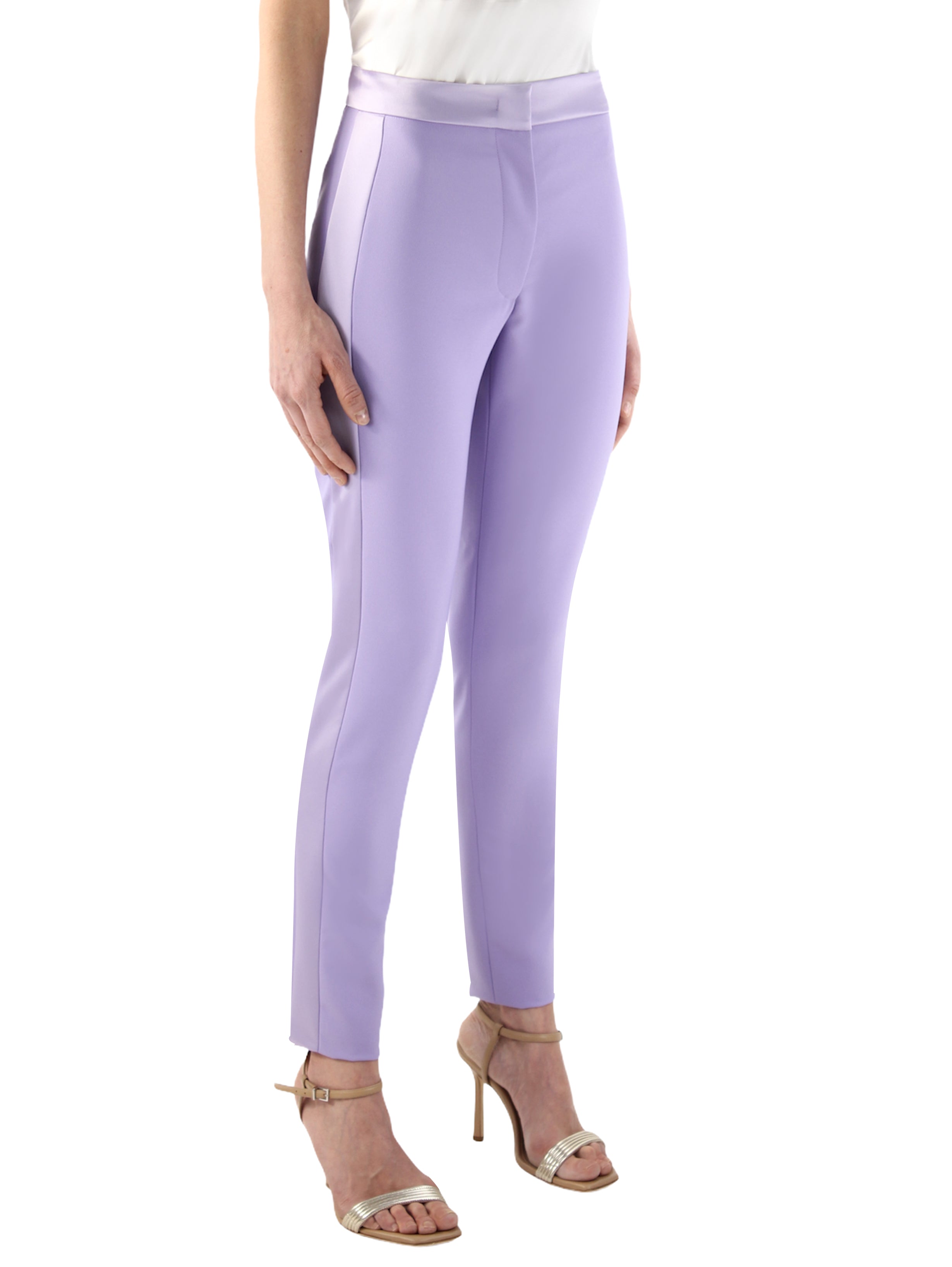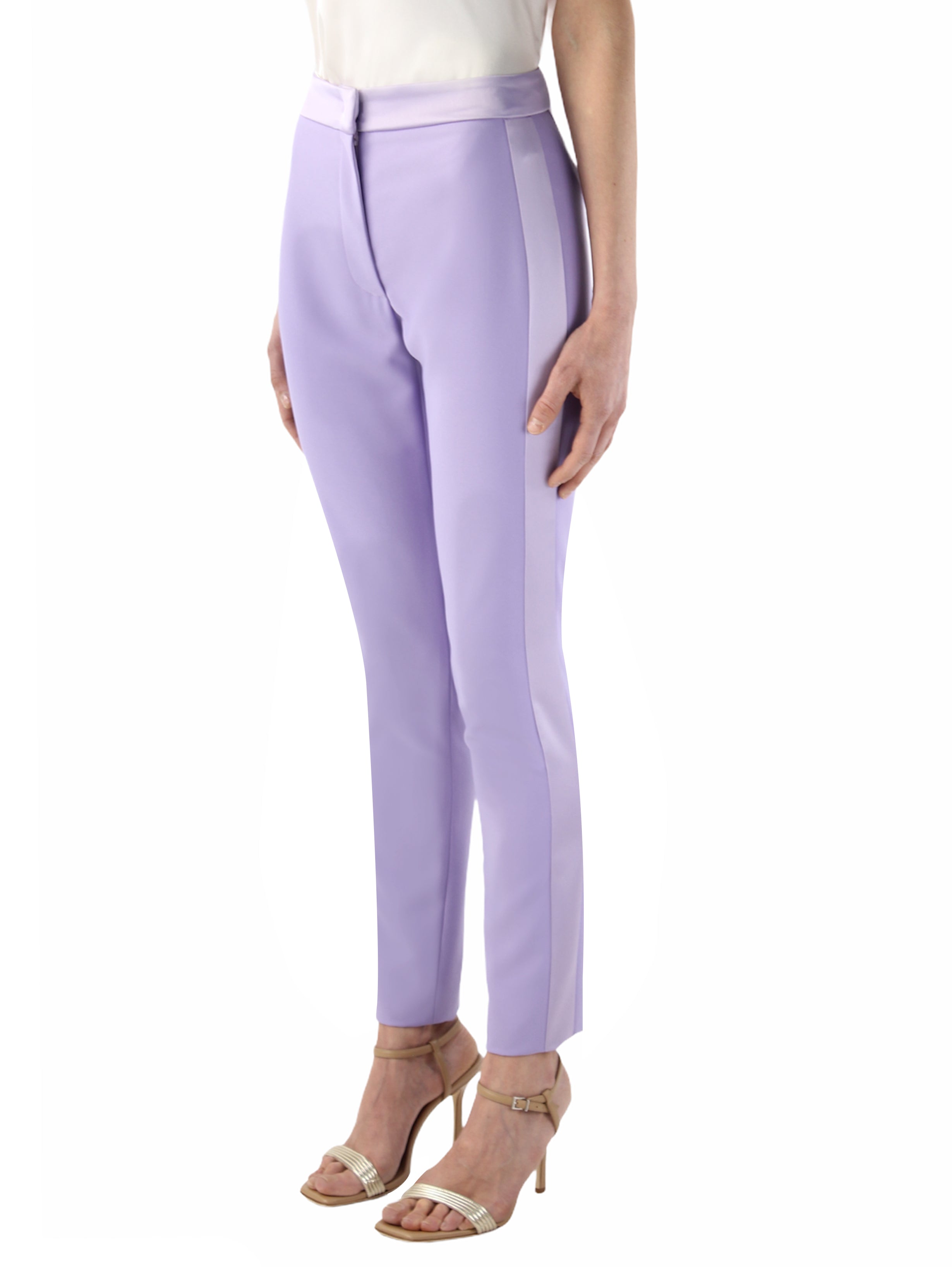DORIS S NATALIA trousers in wisteria colour, a delicate nuance that embraces brightness and is captivating at the same time. . High-waisted trousers, with satin side band and concealed zip. Slim fit.