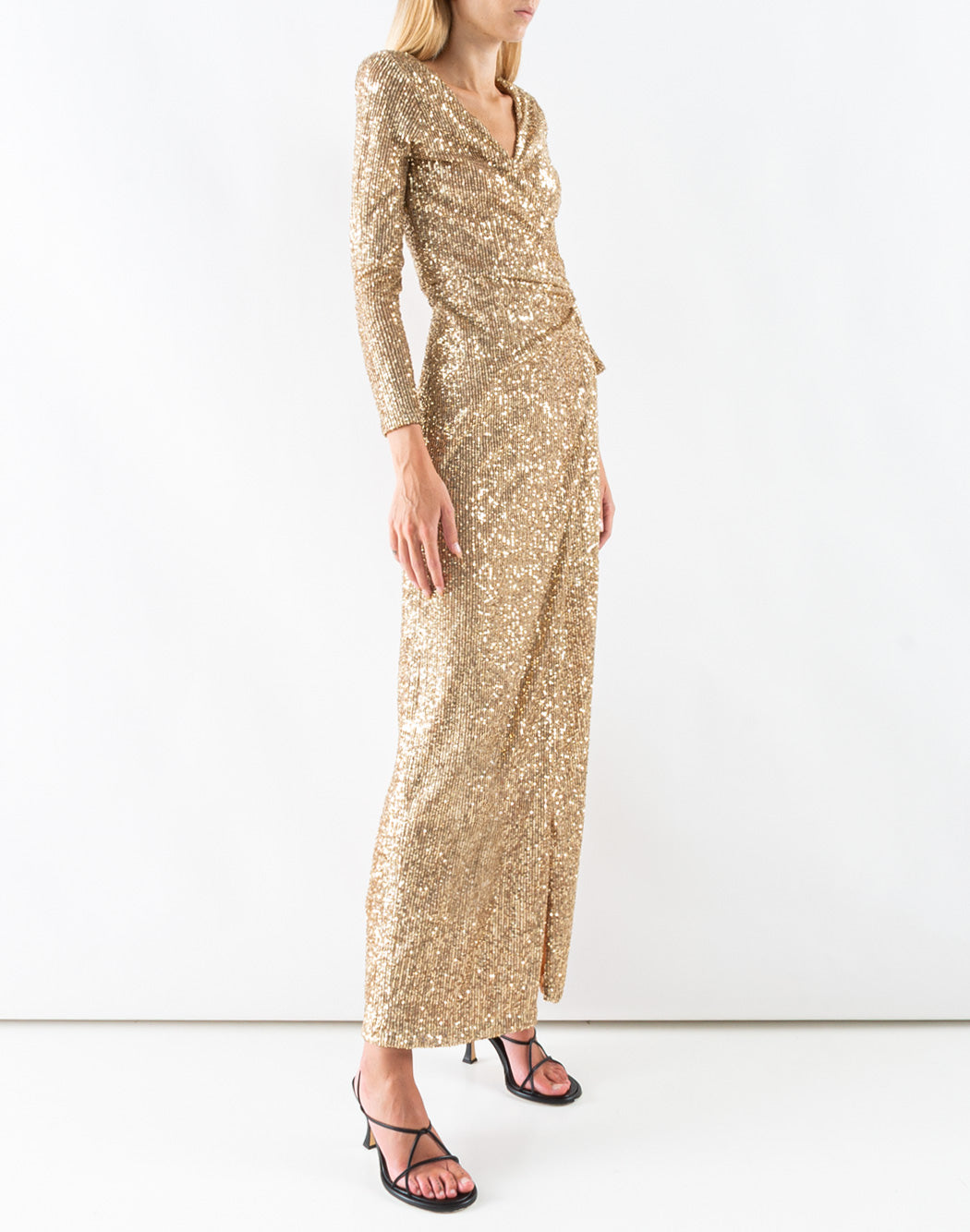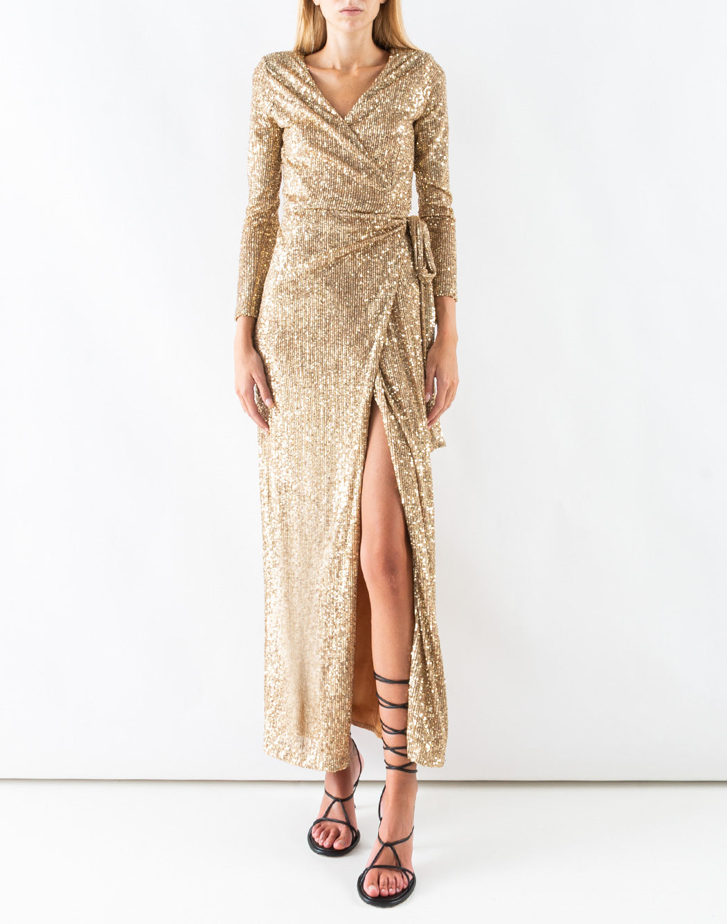 DORIS S long dress with all-over sequins, v-neck and long sleeves. Wrap closure with tone-on-tone strap to tie on the side.