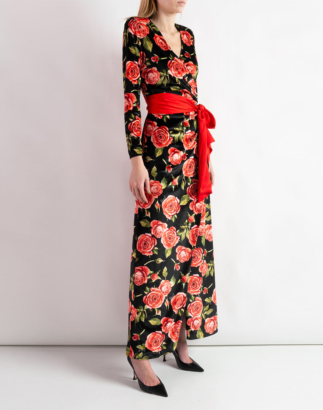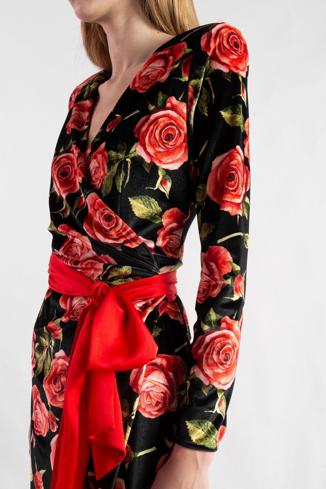 DORIS S long dress in velvet with large rose print, v-neck and long sleeves. Wrap closure with contrasting sash.