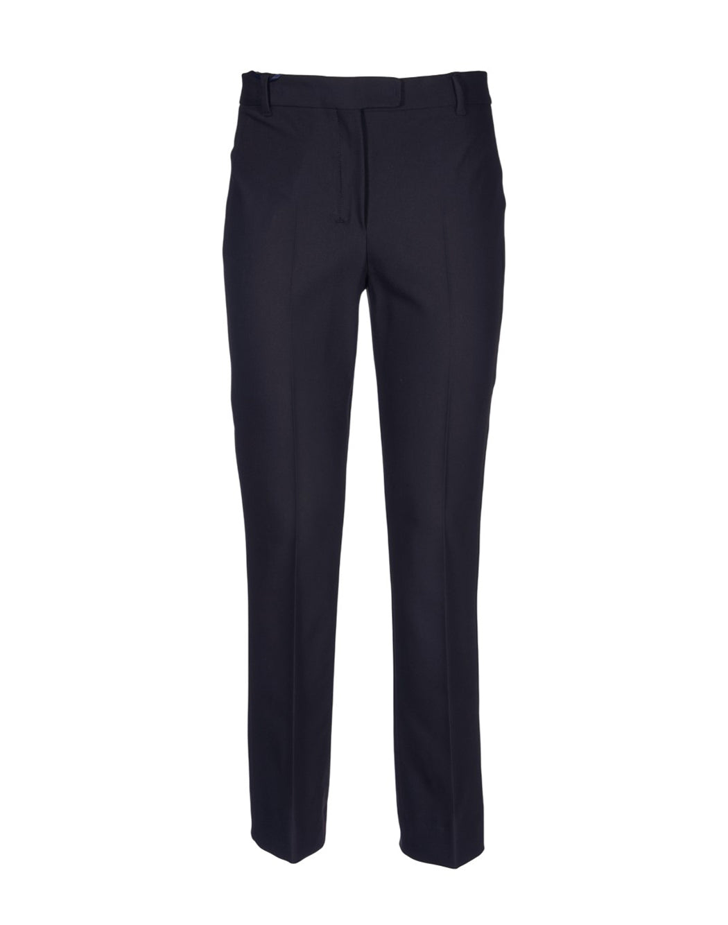 Trousers in double stretch cotton and viscose fabric, characterized by a slim fit silhouette, slightly flared at the hem, with an ironed crease on the leg and belt loops. Closure with high waistband, zip with flap and hook.