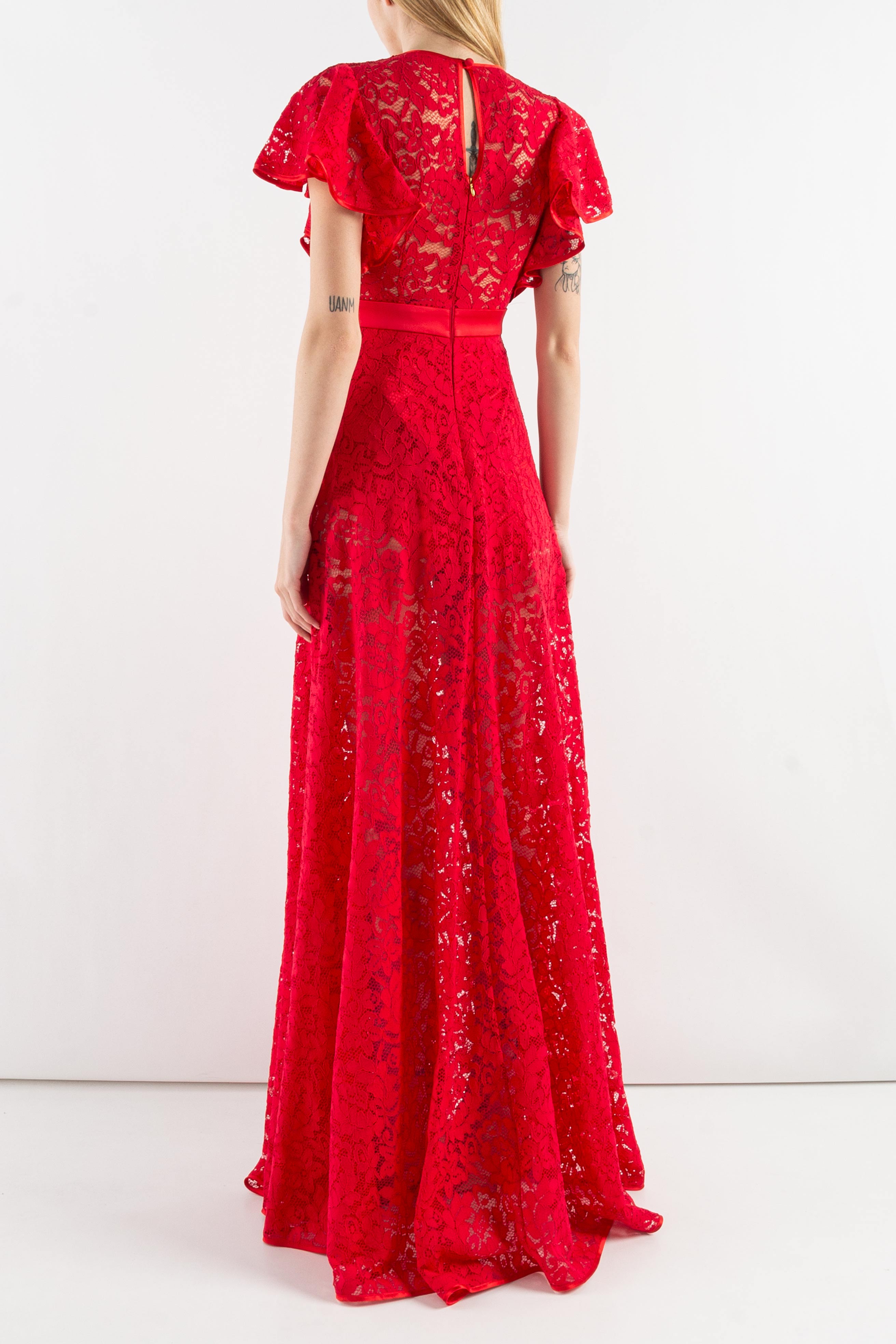 DORIS S lace dress with short sleeves with ruffles, transparent V-neckline, zip closure and solid color band at the waist.