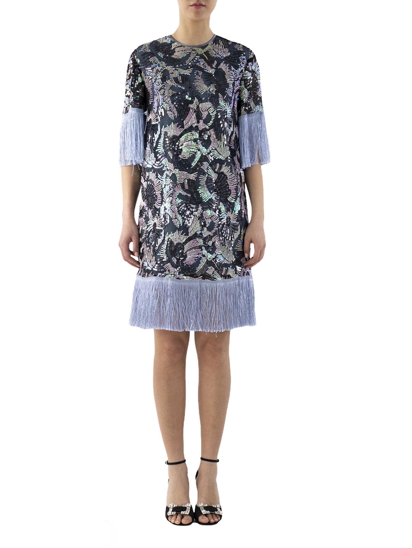 DORIS S BETH dress with a soft line recalls a 70s-inspired flowing silhouette. The model features bright sequins, a crew neckline and short sleeves. Contrasting fringe detail on sleeves and hem. Button closure on the back.