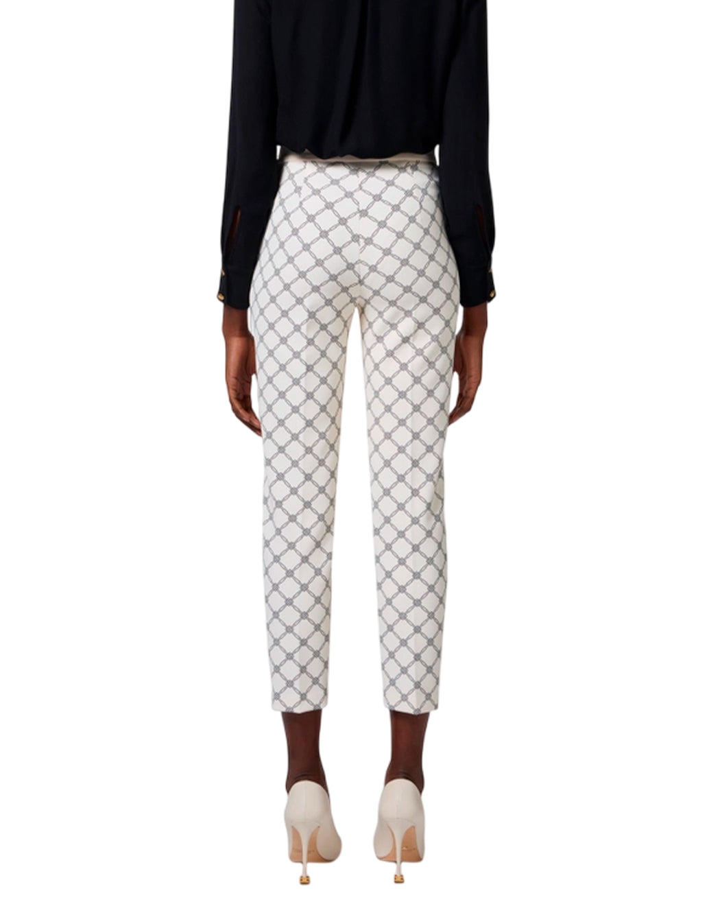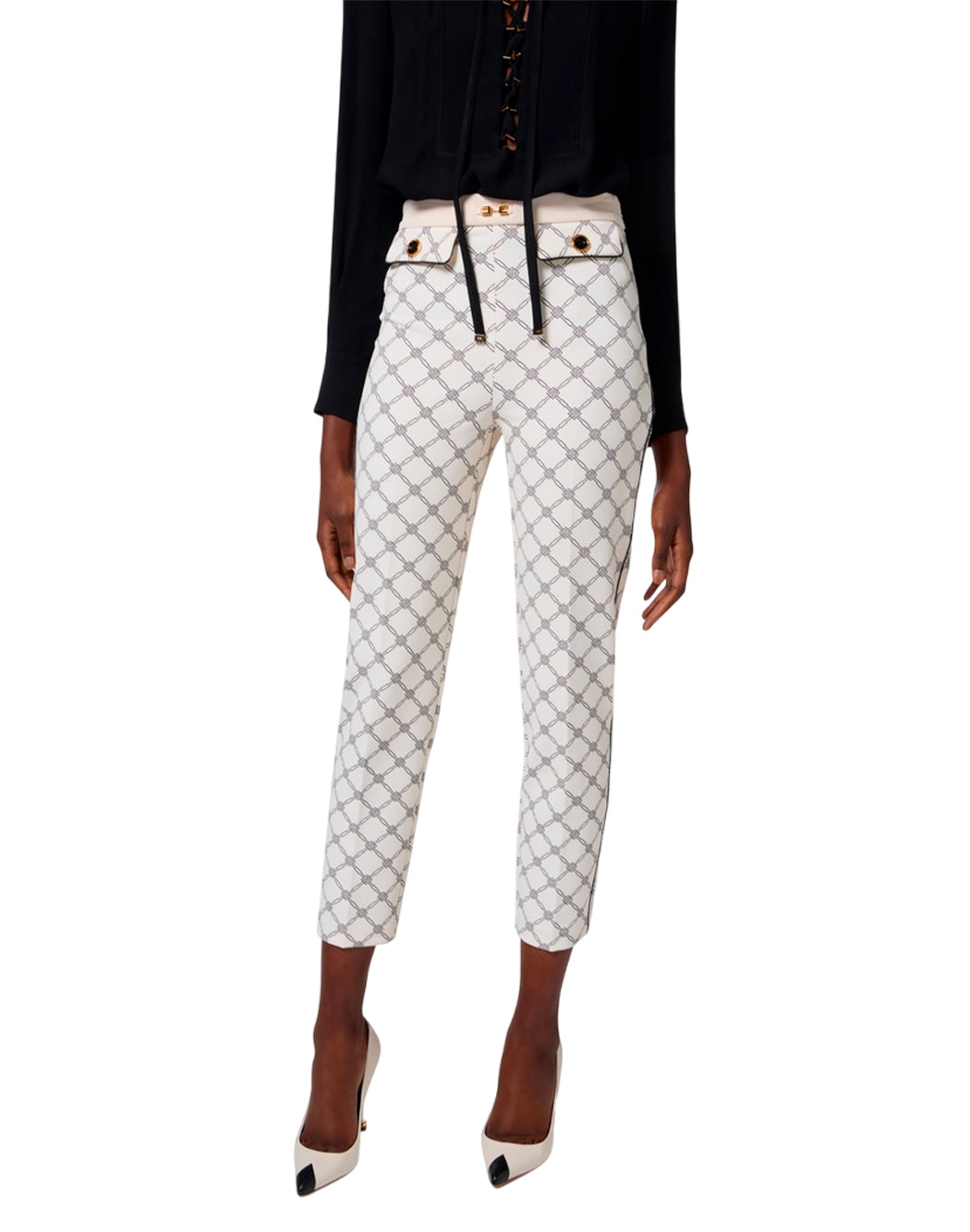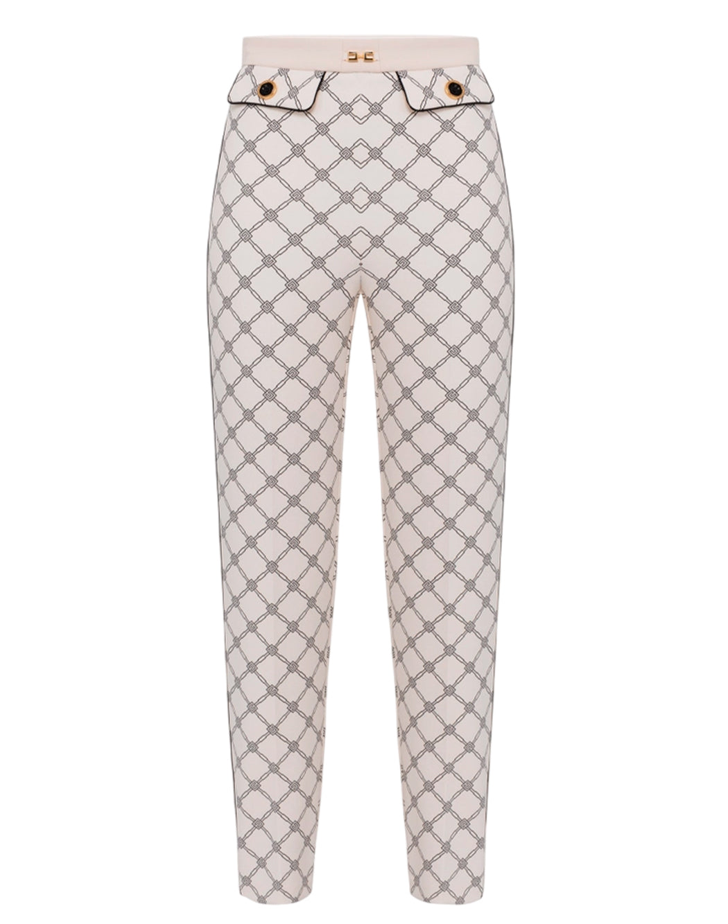Crepe trousers with a slim fit and ankle length. They stand out for their all-over diamond print and contrasting piping. Embellished by the micro clamp with logo on the cummerbund and the buttons with golden metal ring on the flaps.