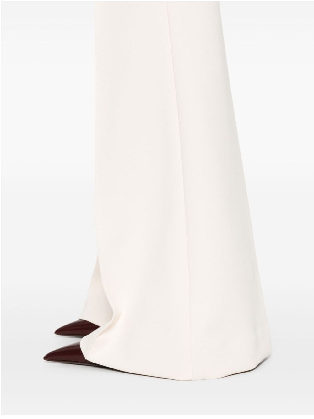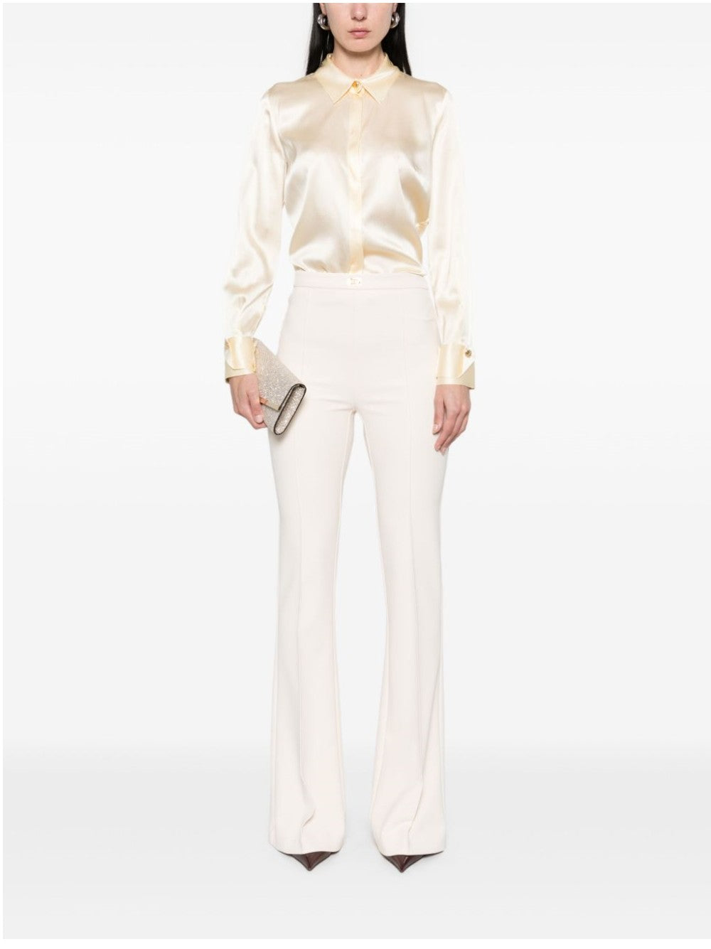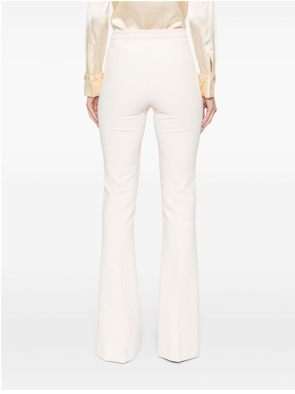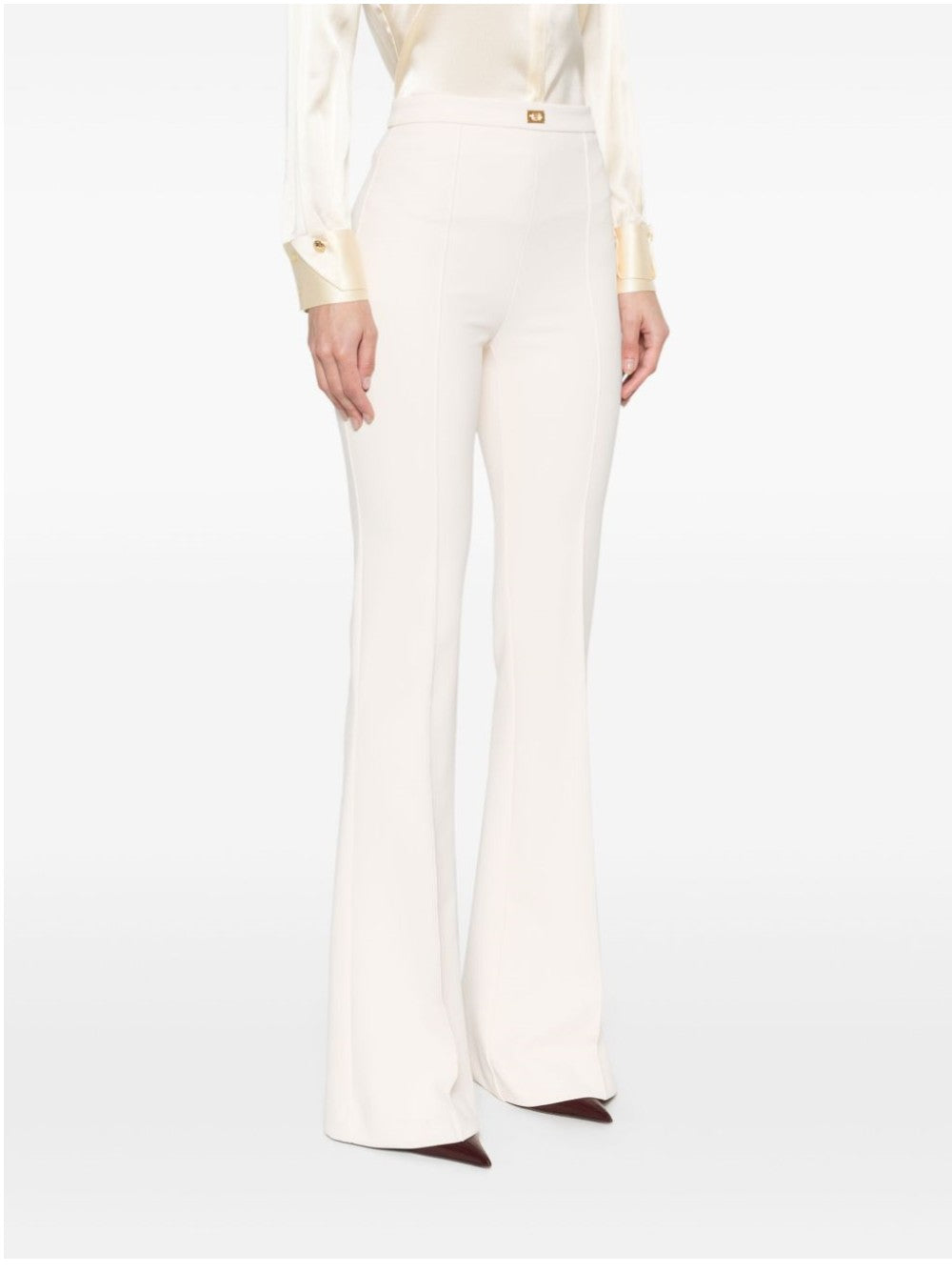 Elisabetta Franchi flared trousers in stretch crêpe characterized by a slim fit that widens towards the bottom, creating an elegant bell-shaped effect. The waist band is enriched by a golden metal logo plaque, adding a distinctive touch to the garment. Part of the Essential collection, these trousers are ideal for completing a refined wardrobe, to be worn on a special occasion.
