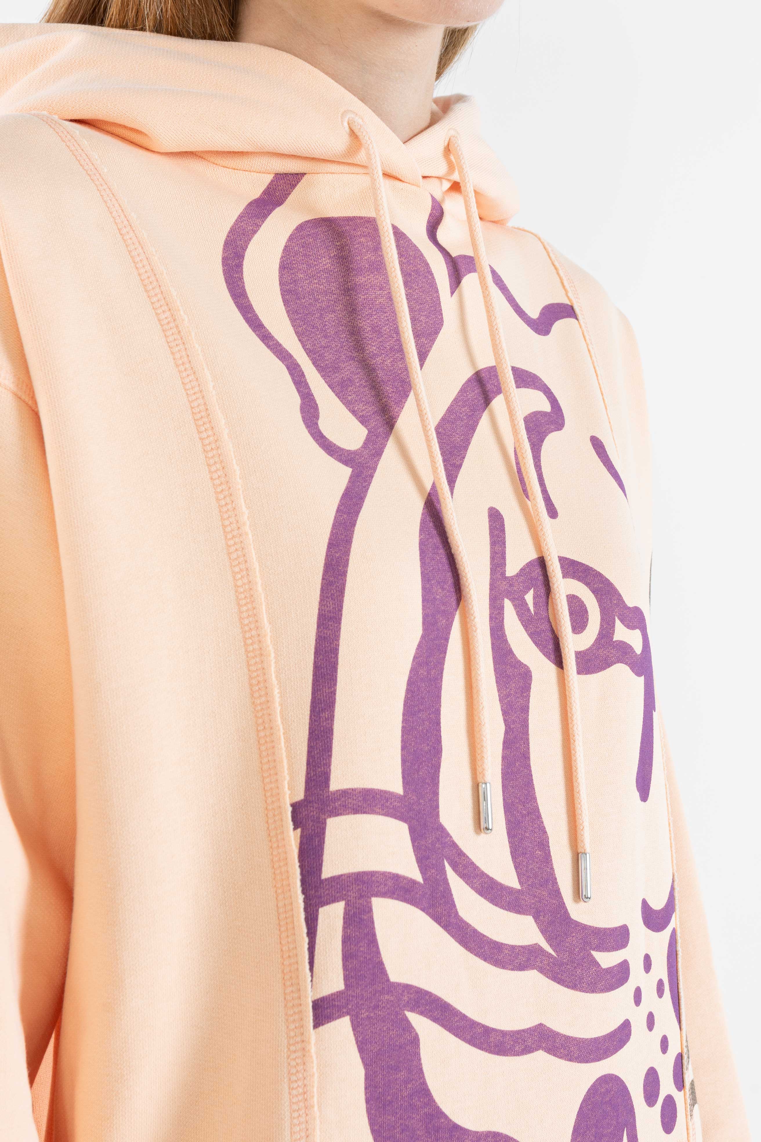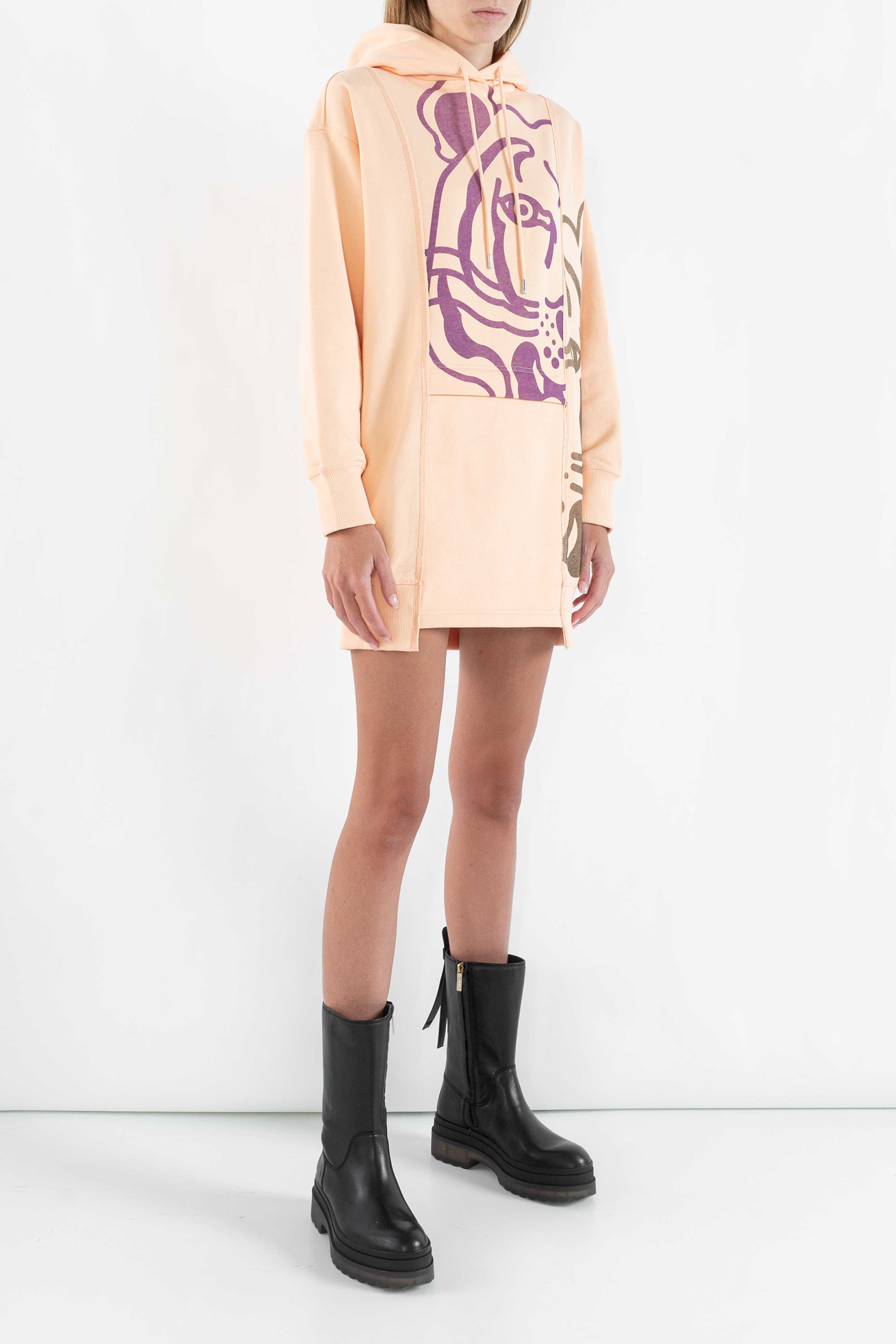 KENZO dress in pink cotton with hood, contrasting iconic tiger print, long sleeves, zip pocket on the front.