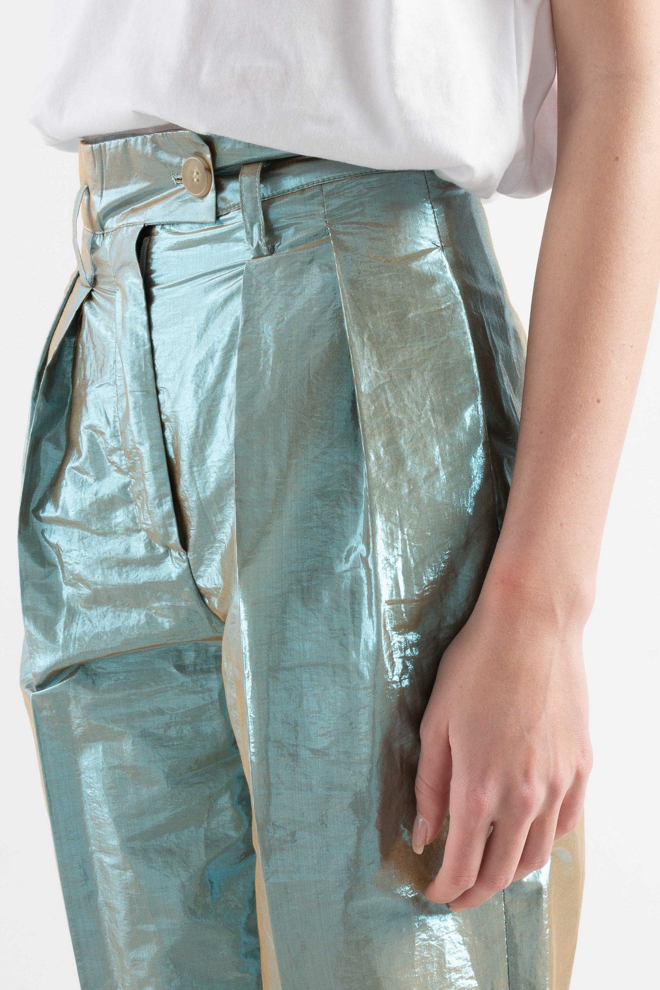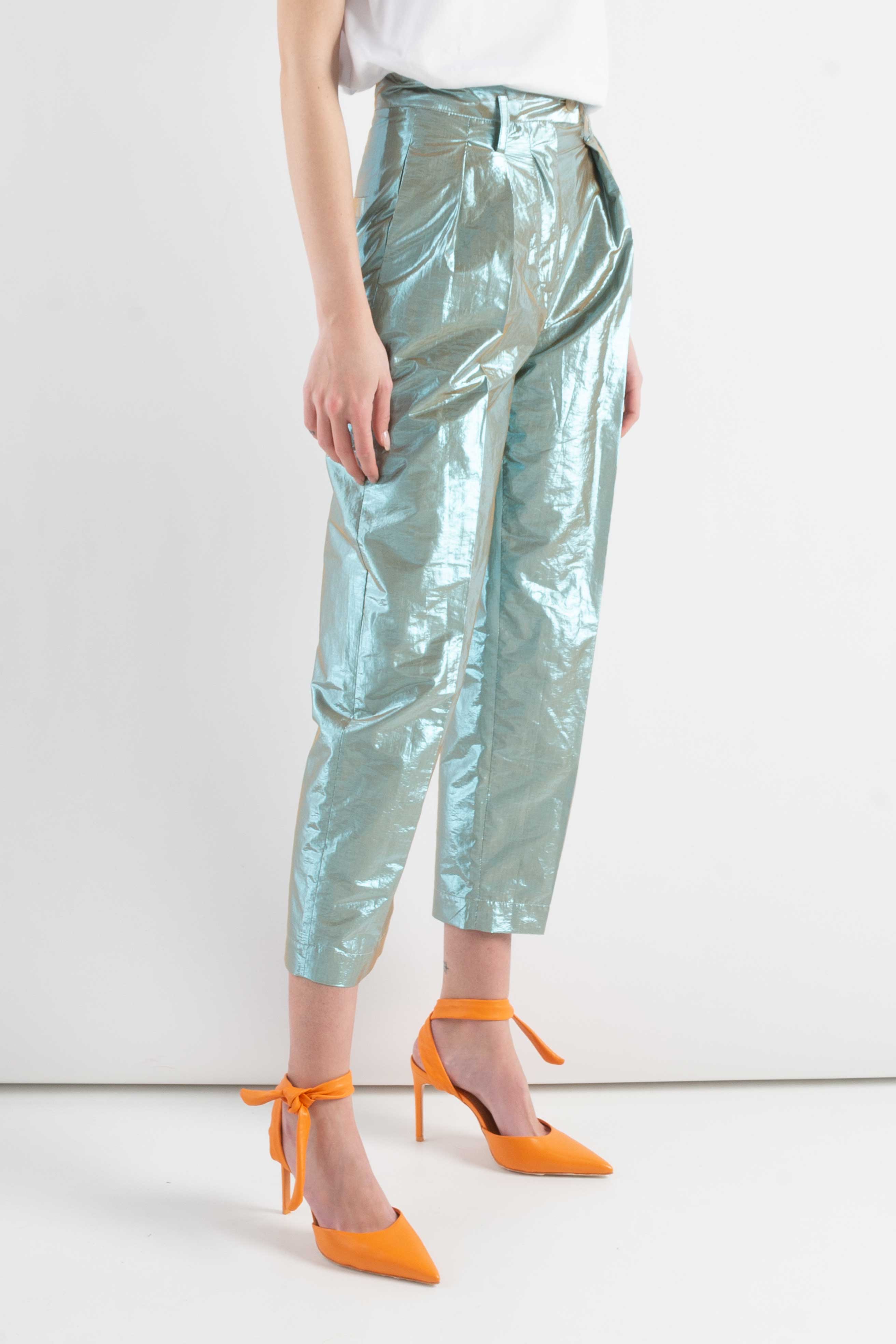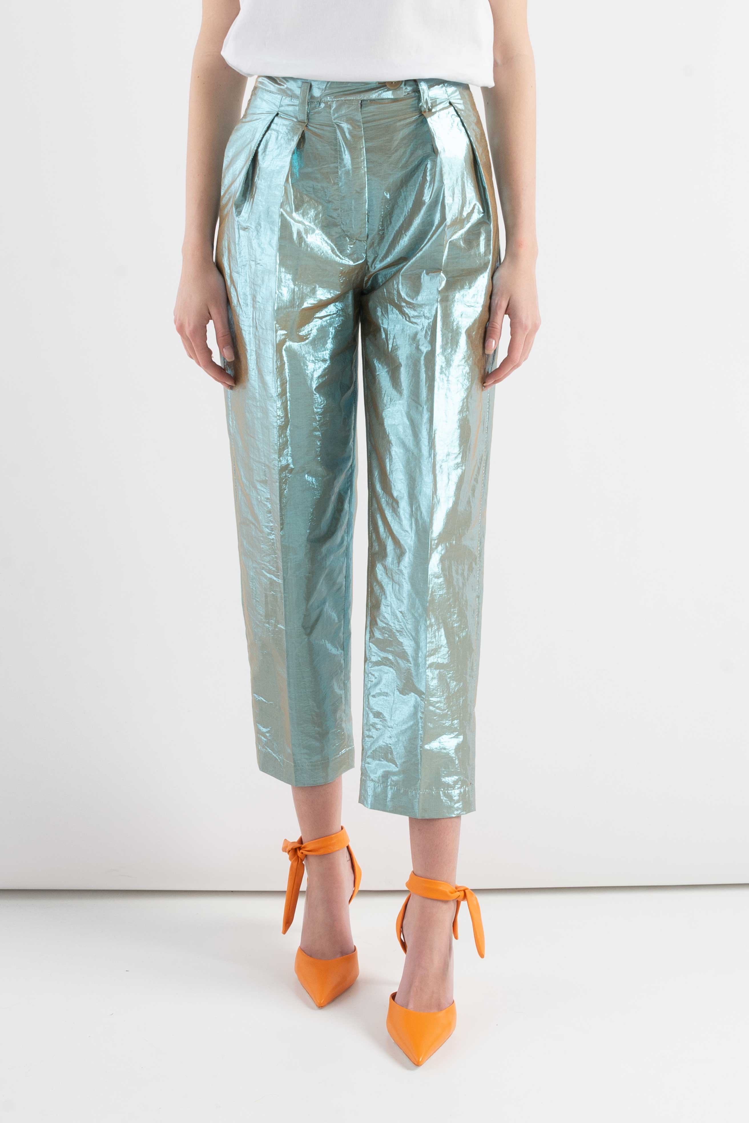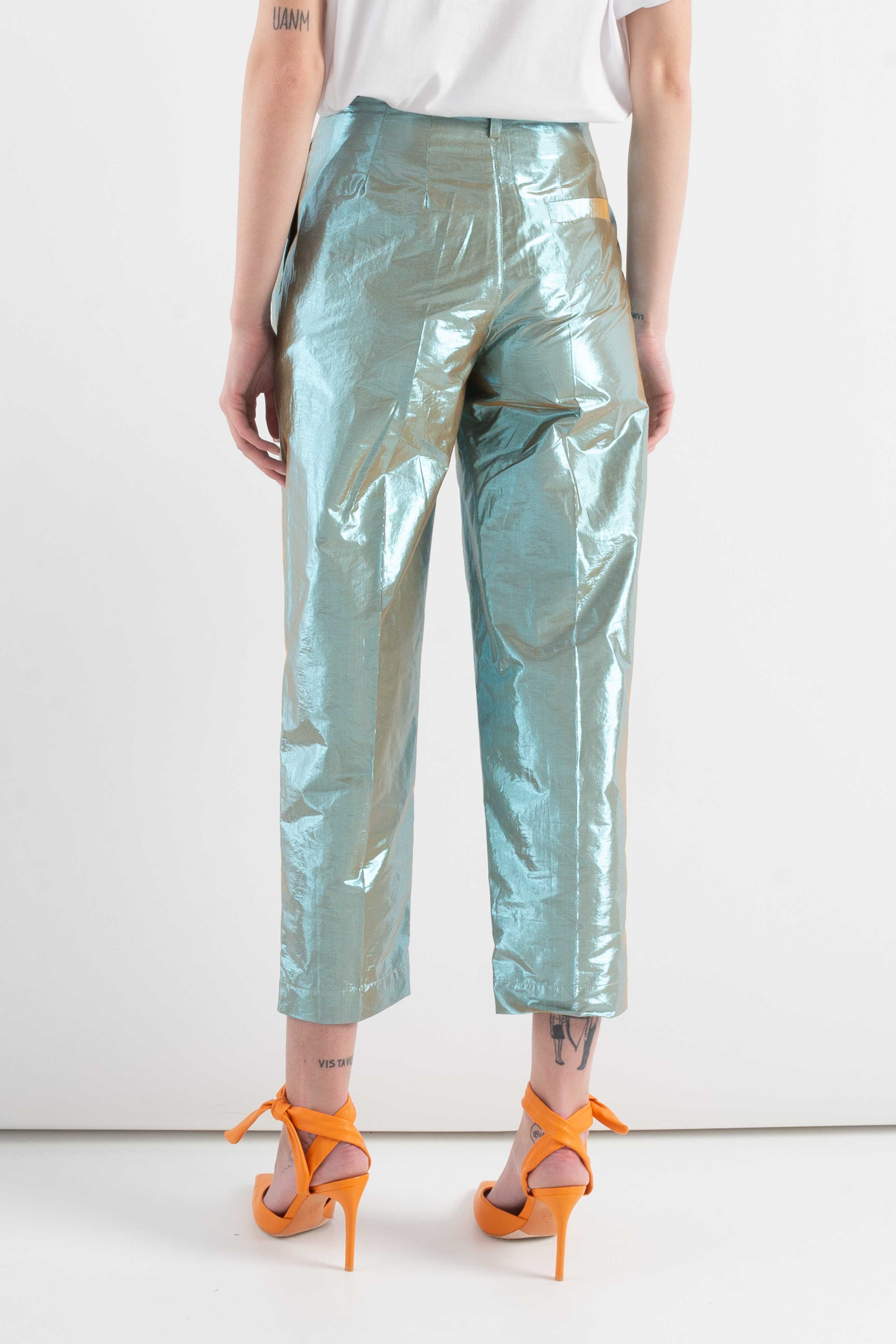 TELA trousers in high-waisted lurex poplin with pleats. Button closure and hidden front zip. Pockets inserted into the welt side.