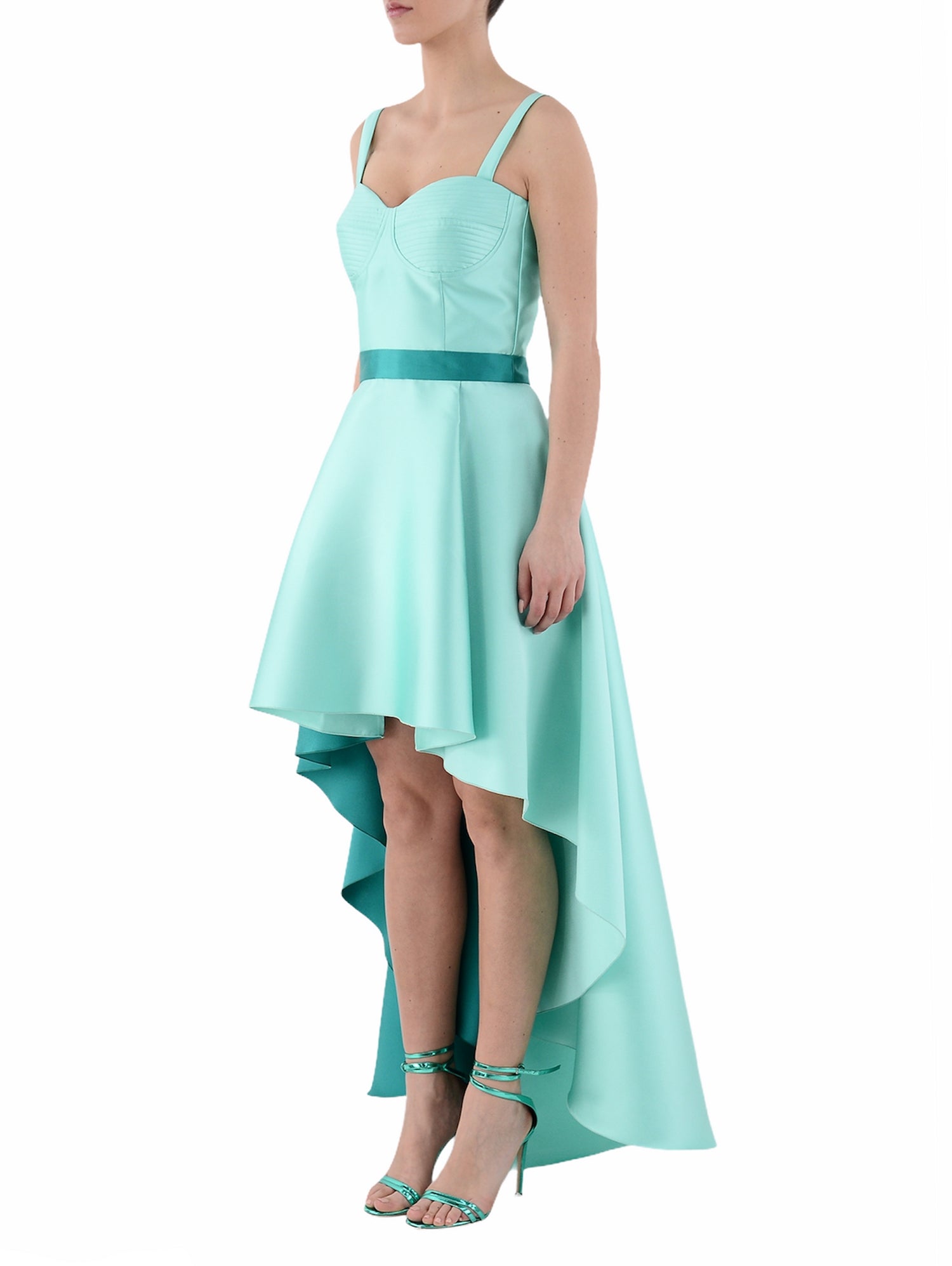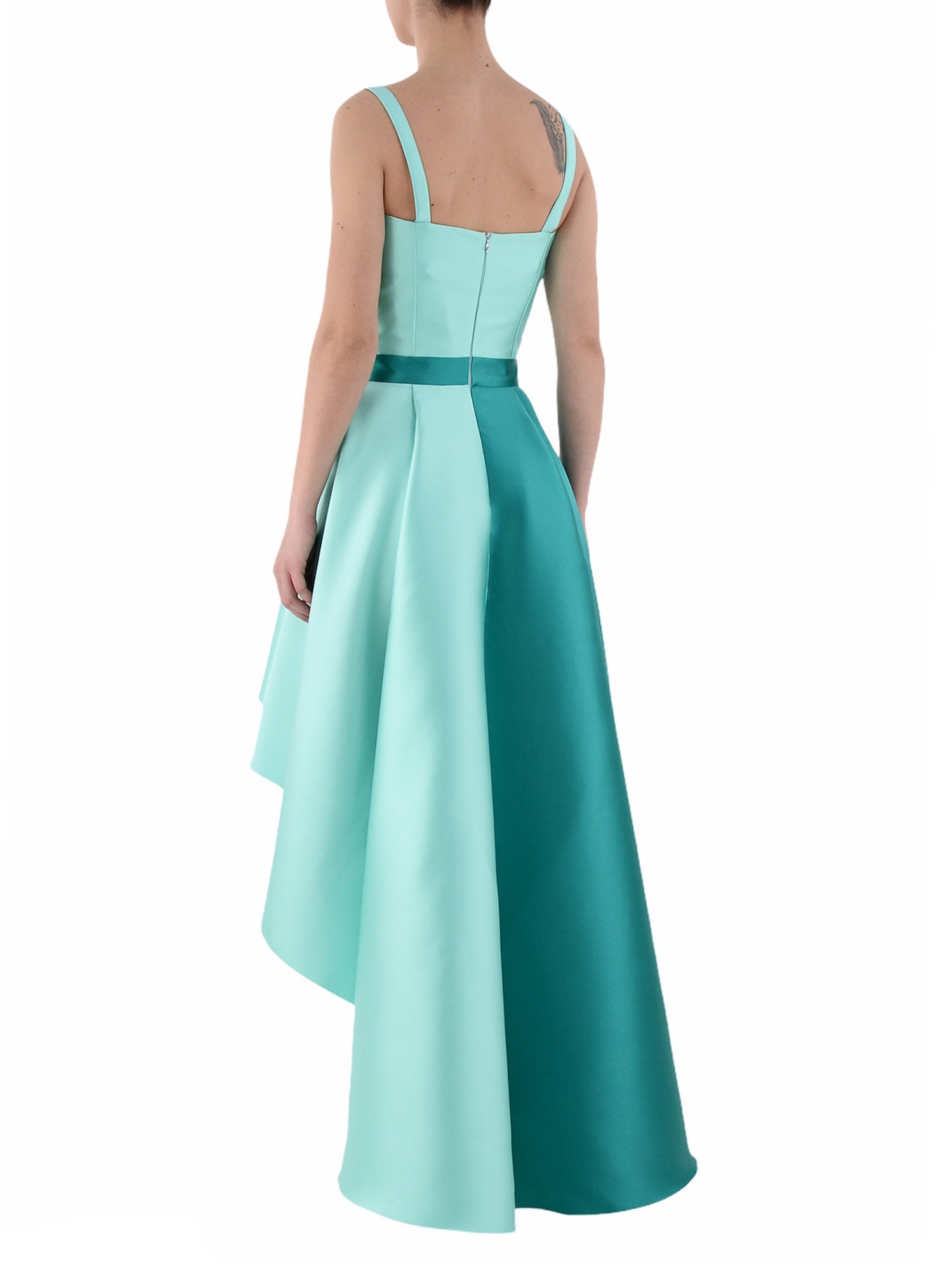 DORIS S JULIA long dress, the model has a bustier bodice, wide pleated skirt, short in front and long in back. Pure femininity, with braces and a two-tone skirt.