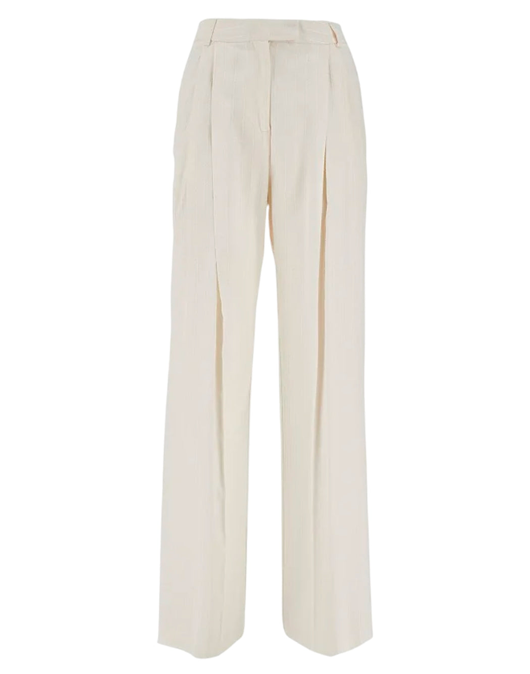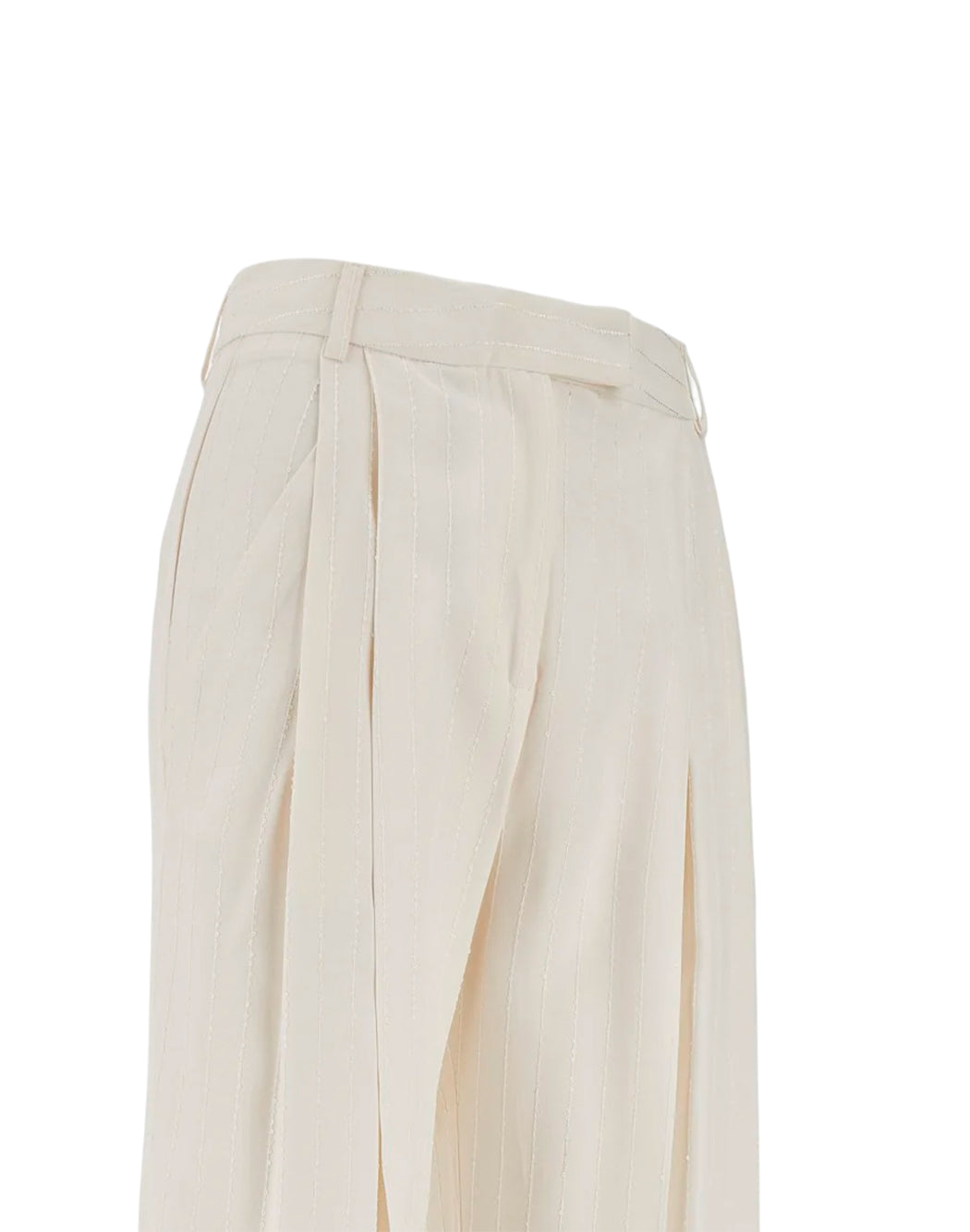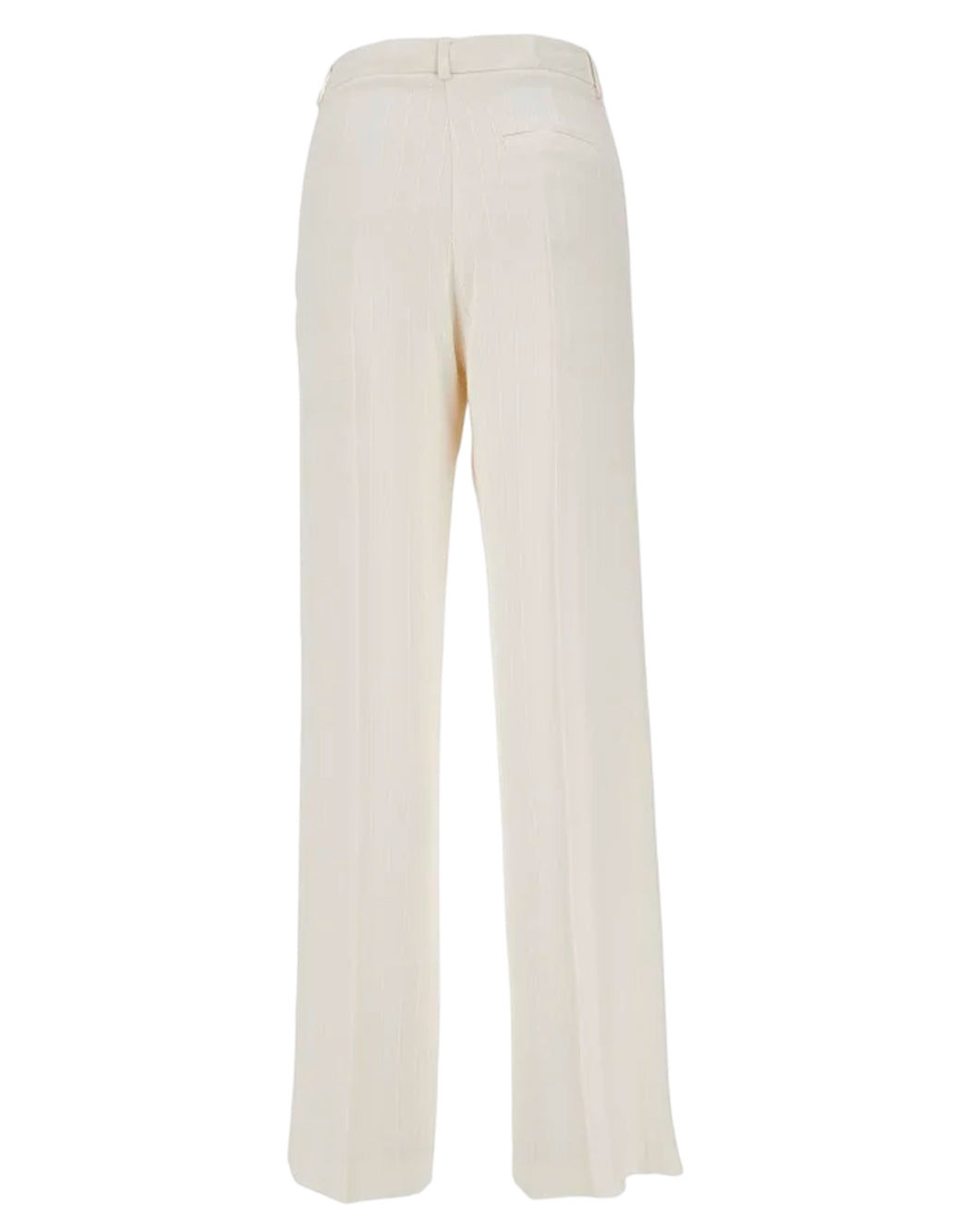 Tailored trousers made of light viscose canvas with a pinstripe pattern embroidered with mini sequins. Relaxed silhouette and wide leg with darts. Side French pockets and one welt pocket on the back. Belt loops, zip fly and concealed hook and button closure.