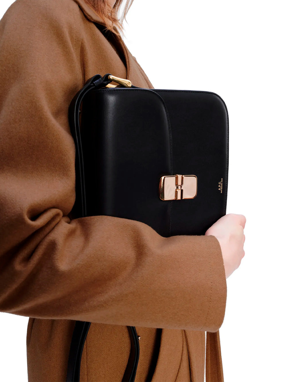 APC Exchange en piel con logo en contraste, bandolera ajustable y cierre de metal dorado.