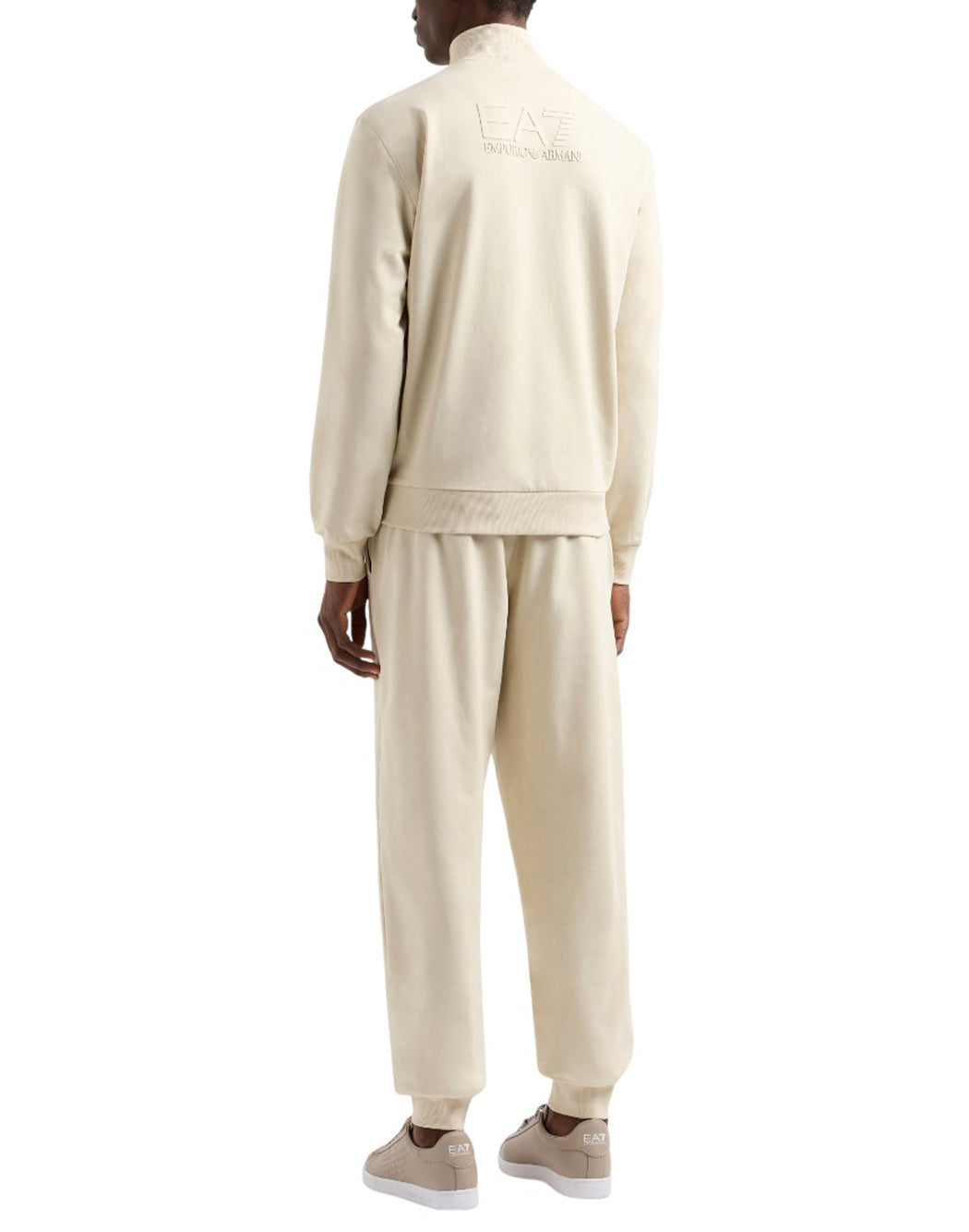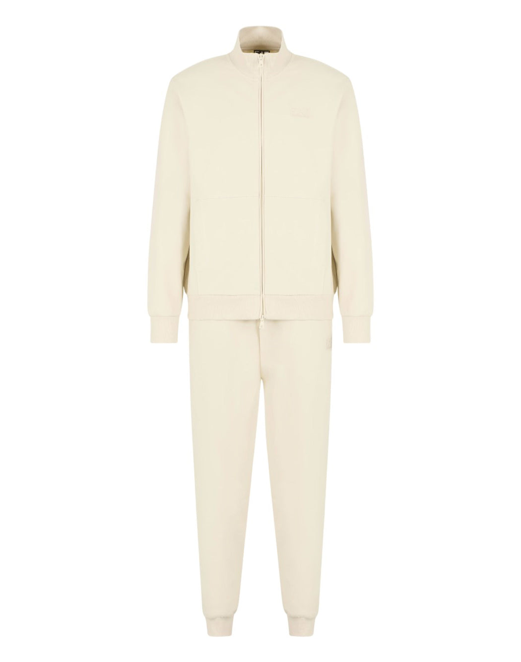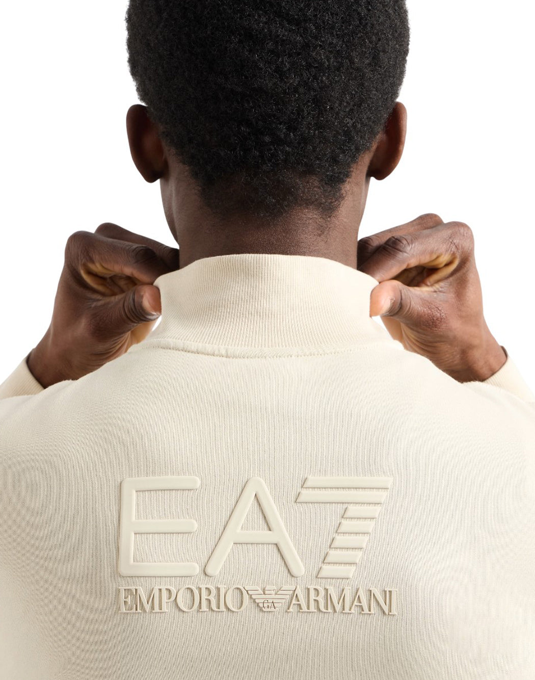 Chándal EA7 compuesto por sudadera con cuello alto, cierre de cremallera y dos bolsillos laterales. En la parte trasera destaca un maxilogotipo EA7. Los pantalones jogger cuentan con cintura elástica y dos bolsillos laterales ribeteados. Ambas prendas están personalizadas con el logo EA7 en contraste, para un look deportivo y moderno.