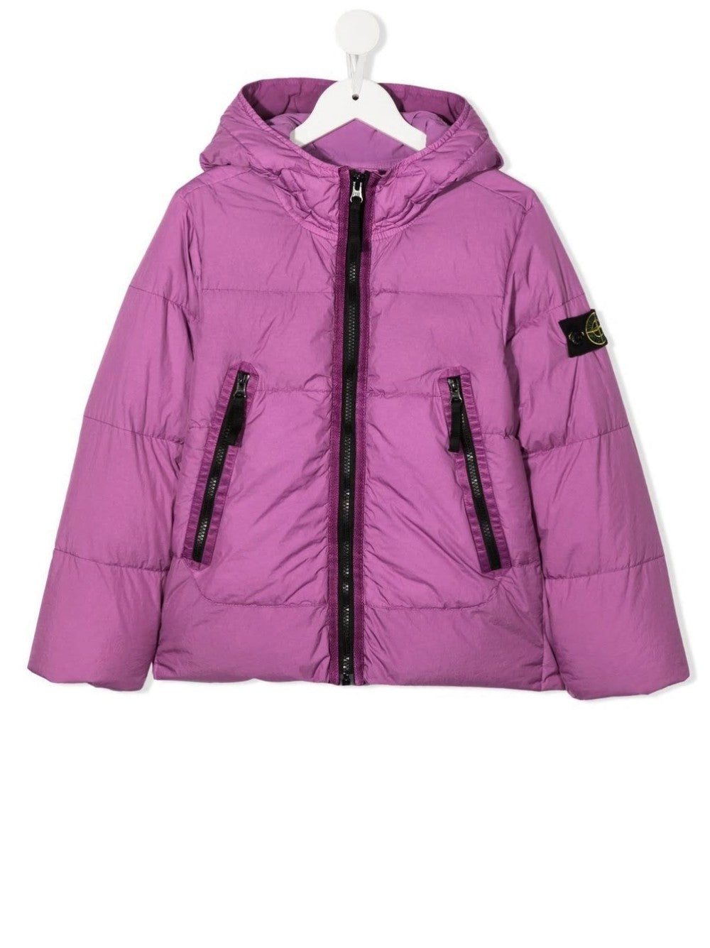 Plumífero STONE ISLAND de nailon acolchado con capucha y manga larga. Cierre frontal con cremallera.