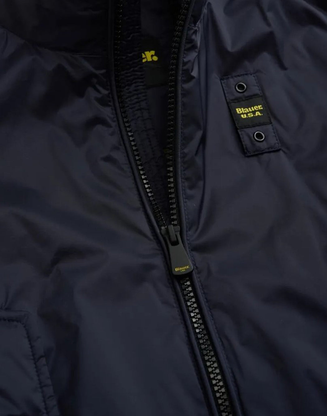 Cazadora bomber Blauer con cuello alto en tejido con elegantes reflejos, perfecta para las noches frescas de verano. Con cierre de cremallera, forro en contraste, dos bolsillos con botones a presión y canalé interno en el cuello, los puños y el dobladillo para un look refinado y versátil.