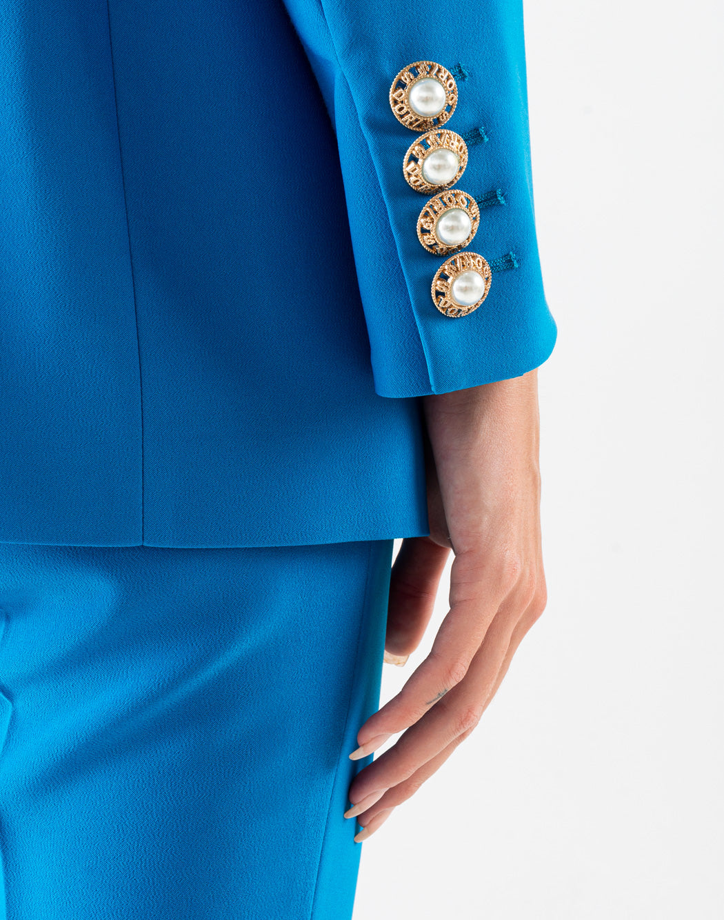 Chaqueta recta DORIS S de cady bajo raso con solapas de pico de raso, bolsillos laterales abiertos y manga larga. Cierre frontal con botón de marca con perla.