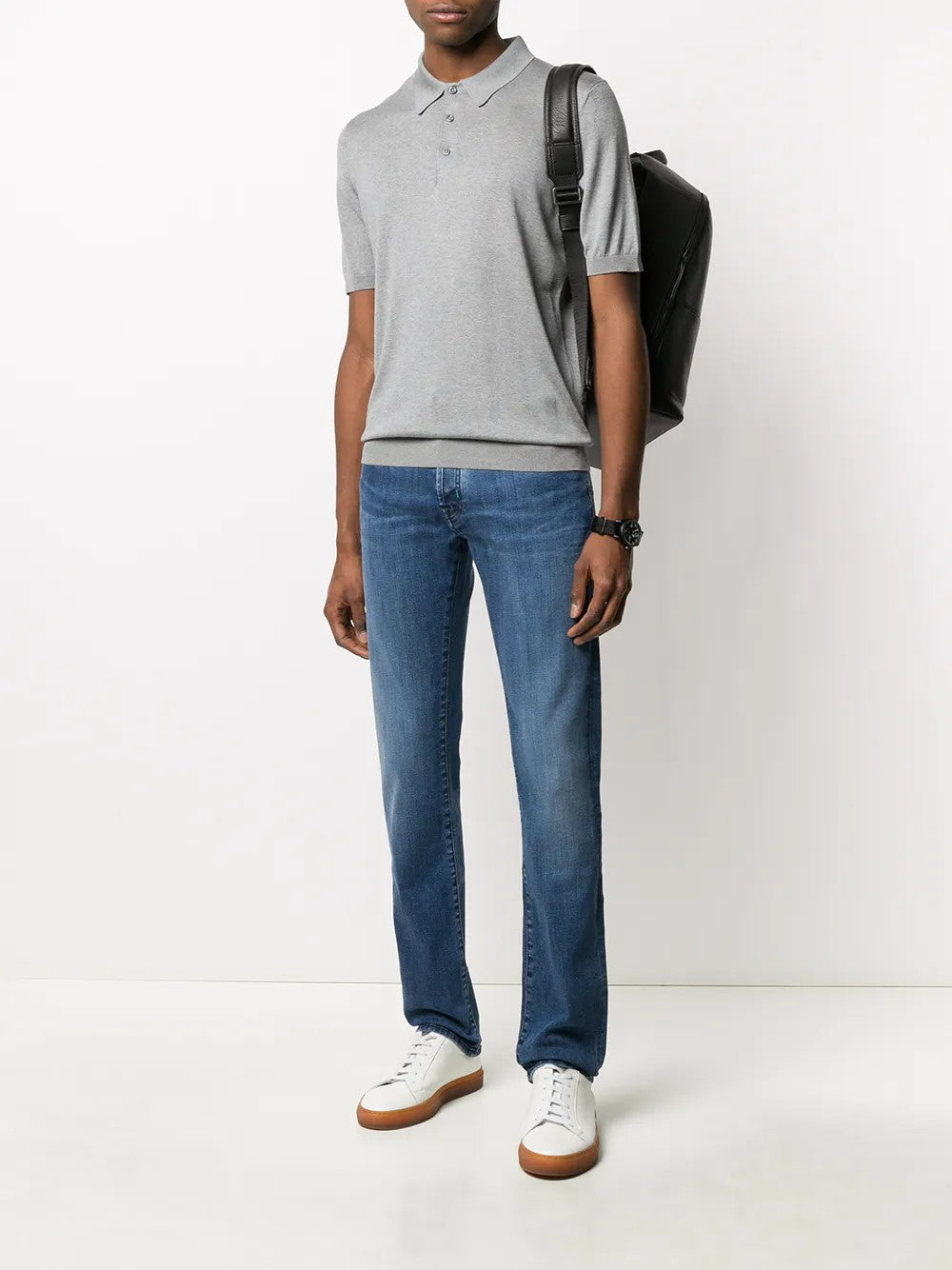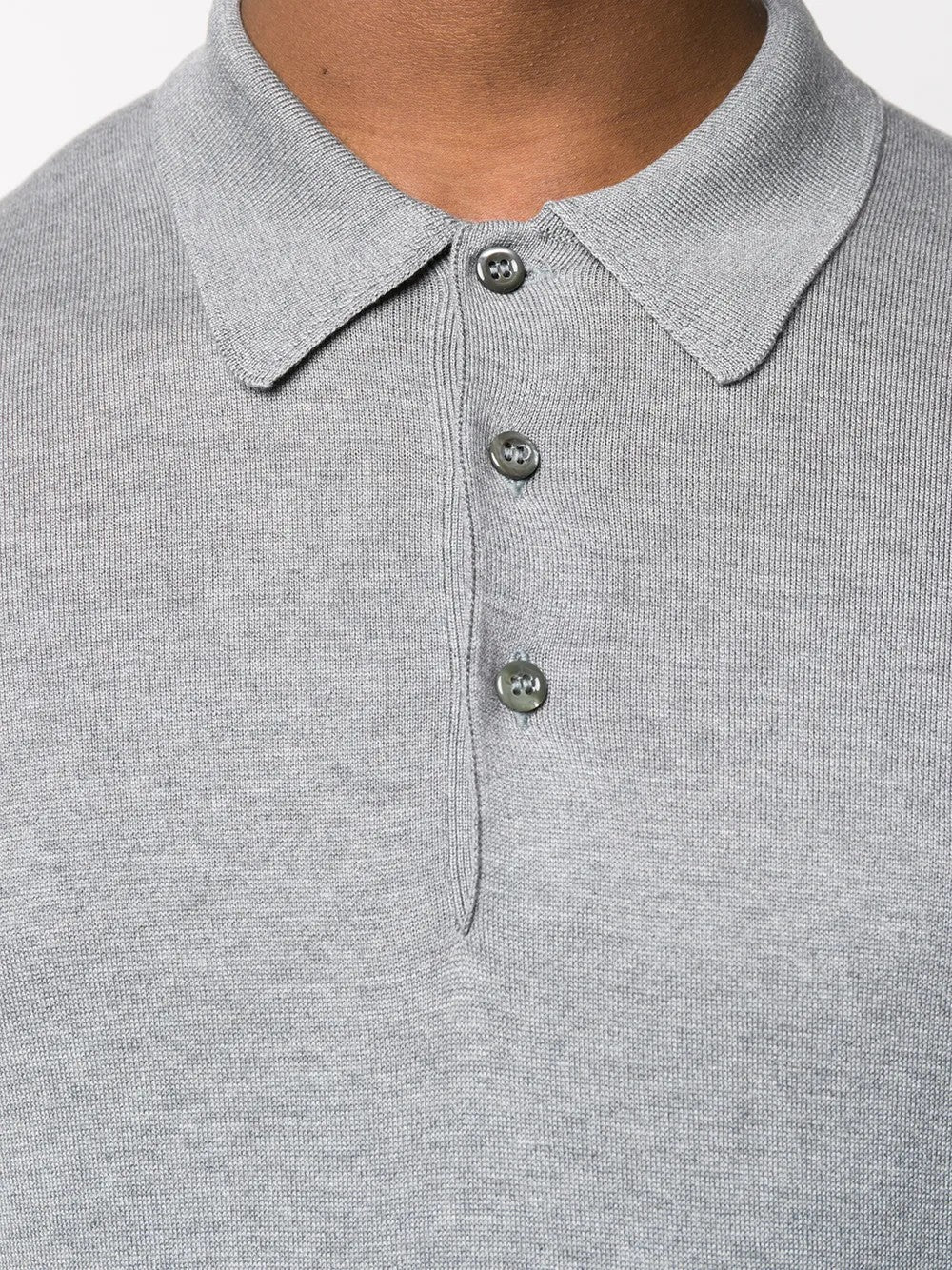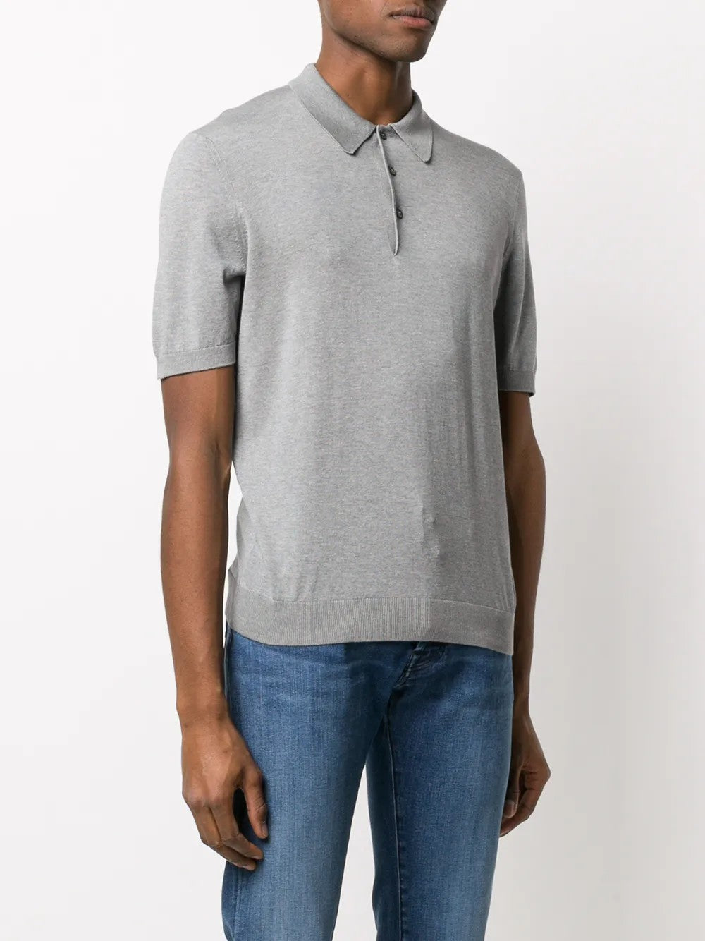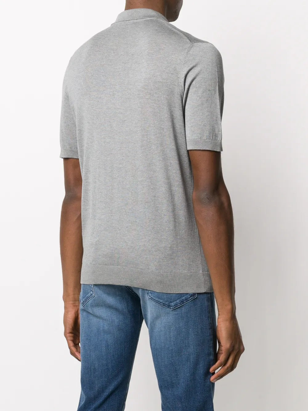 Polo de hombre de alta gama, confeccionado 100% seda, que combina elegancia y comodidad. El diseño presenta un cuello de polo clásico, cierre de tres botones y manga corta con bordes de canalé, ofreciendo un ajuste refinado y sofisticado. La prenda está disponible en tonos marrón y azul claro y está producida en Italia, garantizando la artesanía y la calidad típicas de la marca.