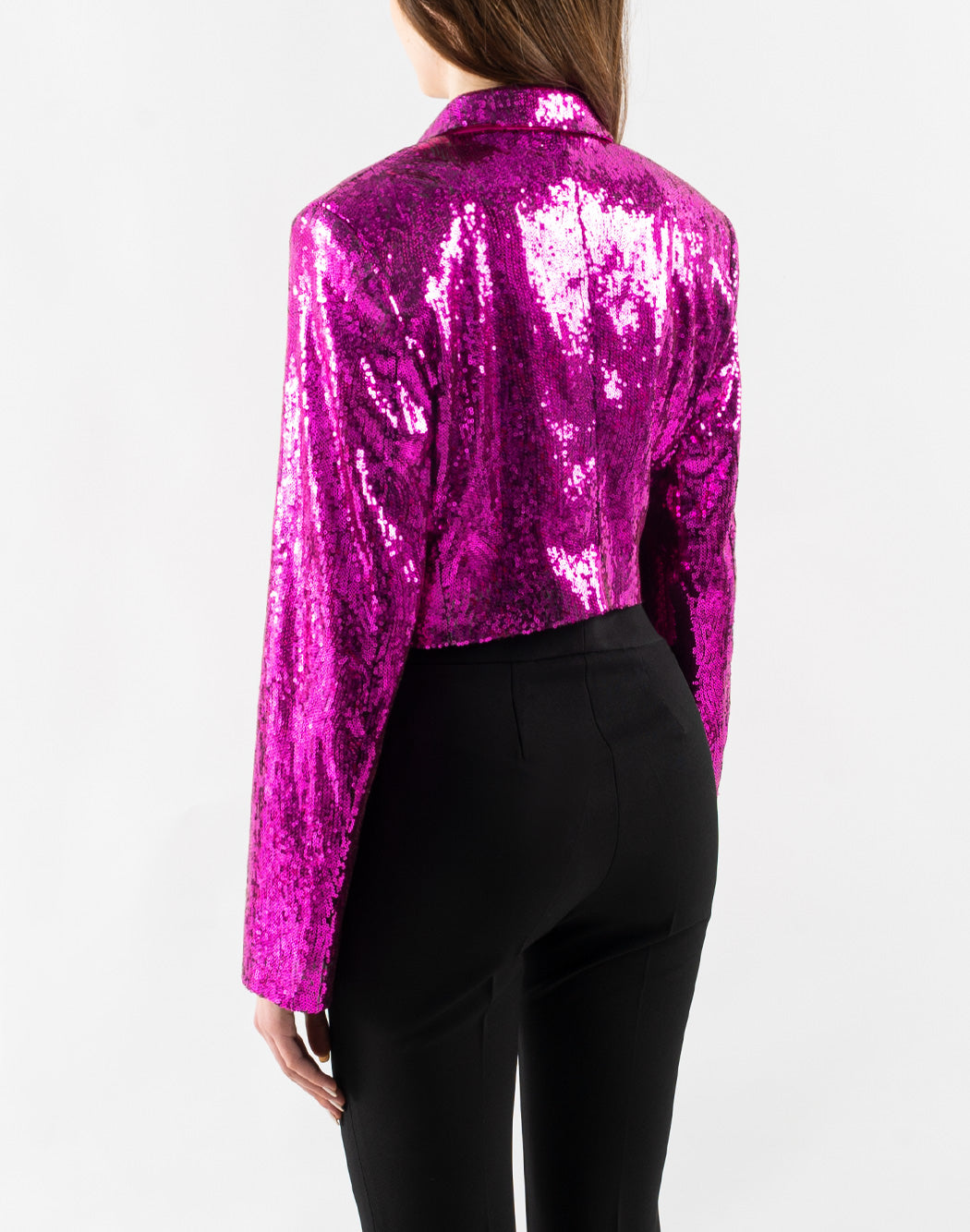 Spencer DORIS S en lentejuelas con solapas de pico de raso, tirantes acolchados y mangas largas.