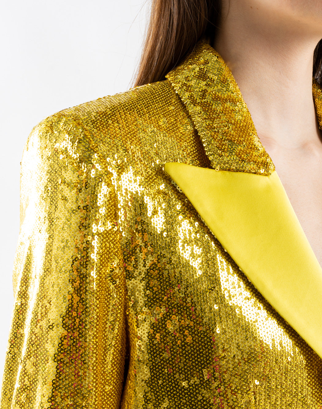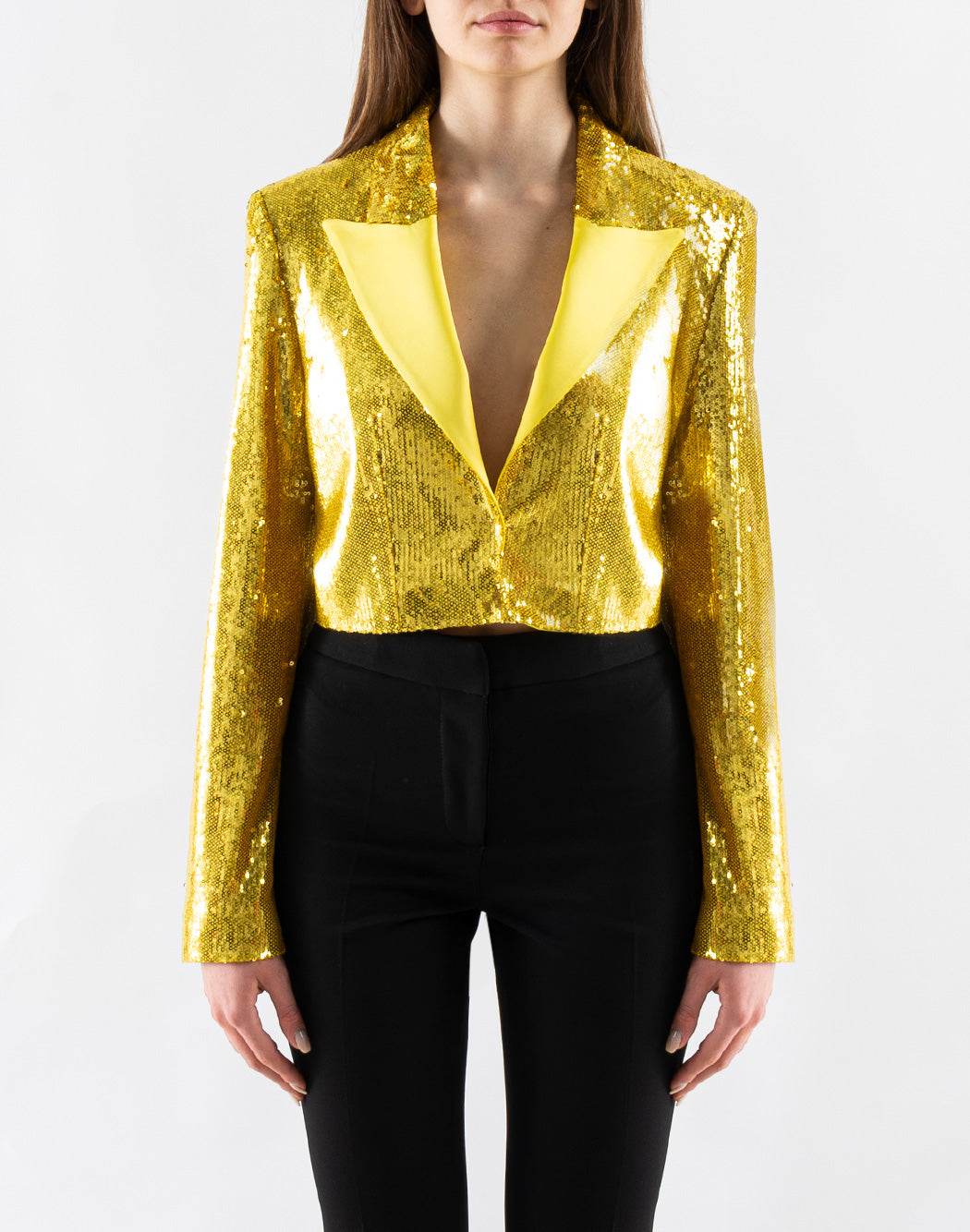 Spencer DORIS S en lentejuelas con solapas de pico de raso, tirantes acolchados y mangas largas.