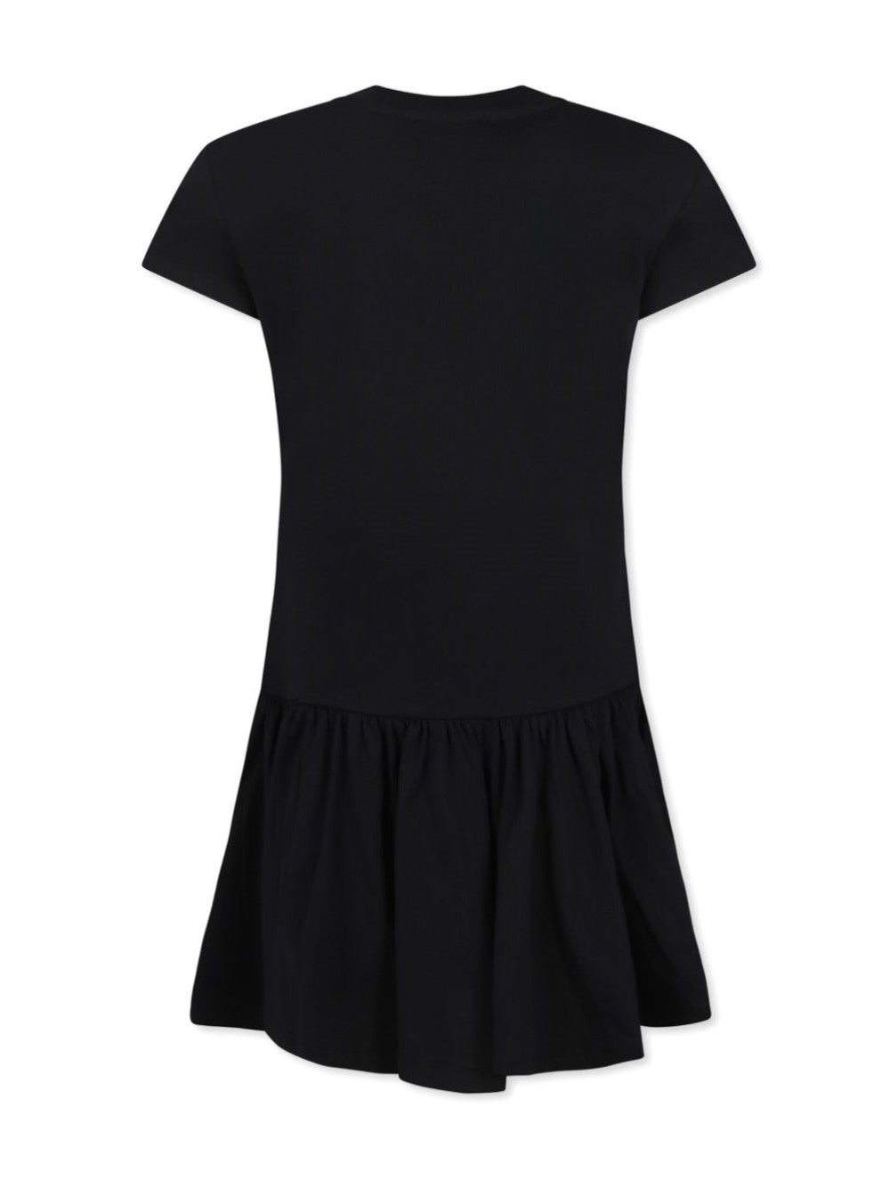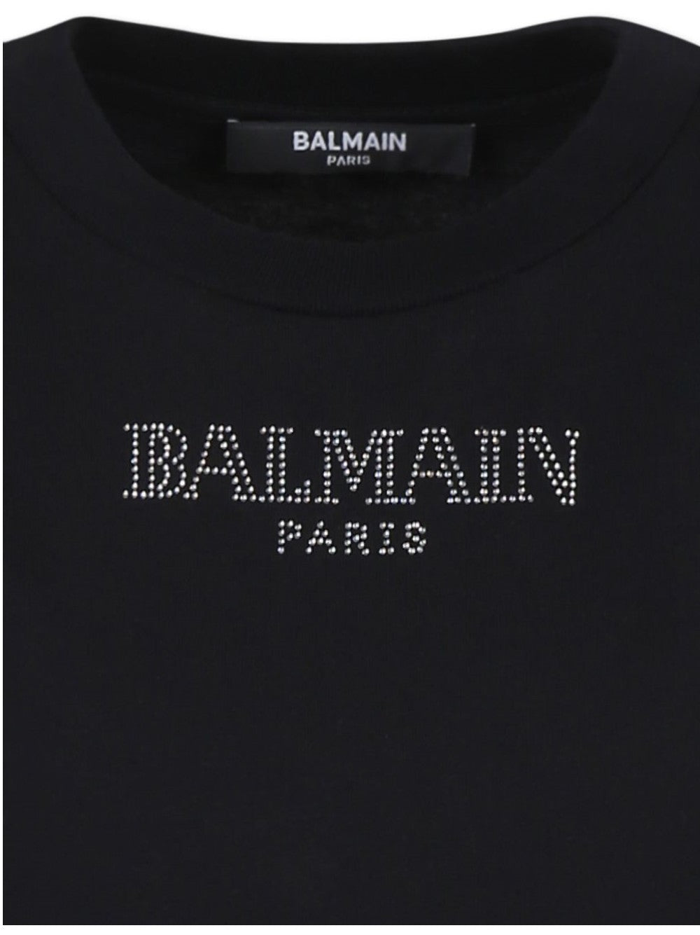 Vestido negro de algodón orgánico, de manga corta, cuello redondo de canalé y volante en el bajo. Está adornado con el logo de Balmain de strass en la parte delantera.