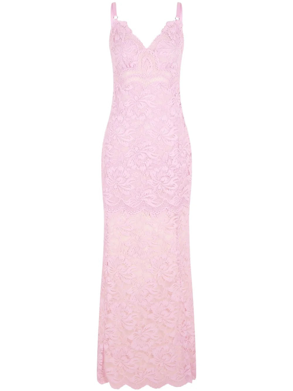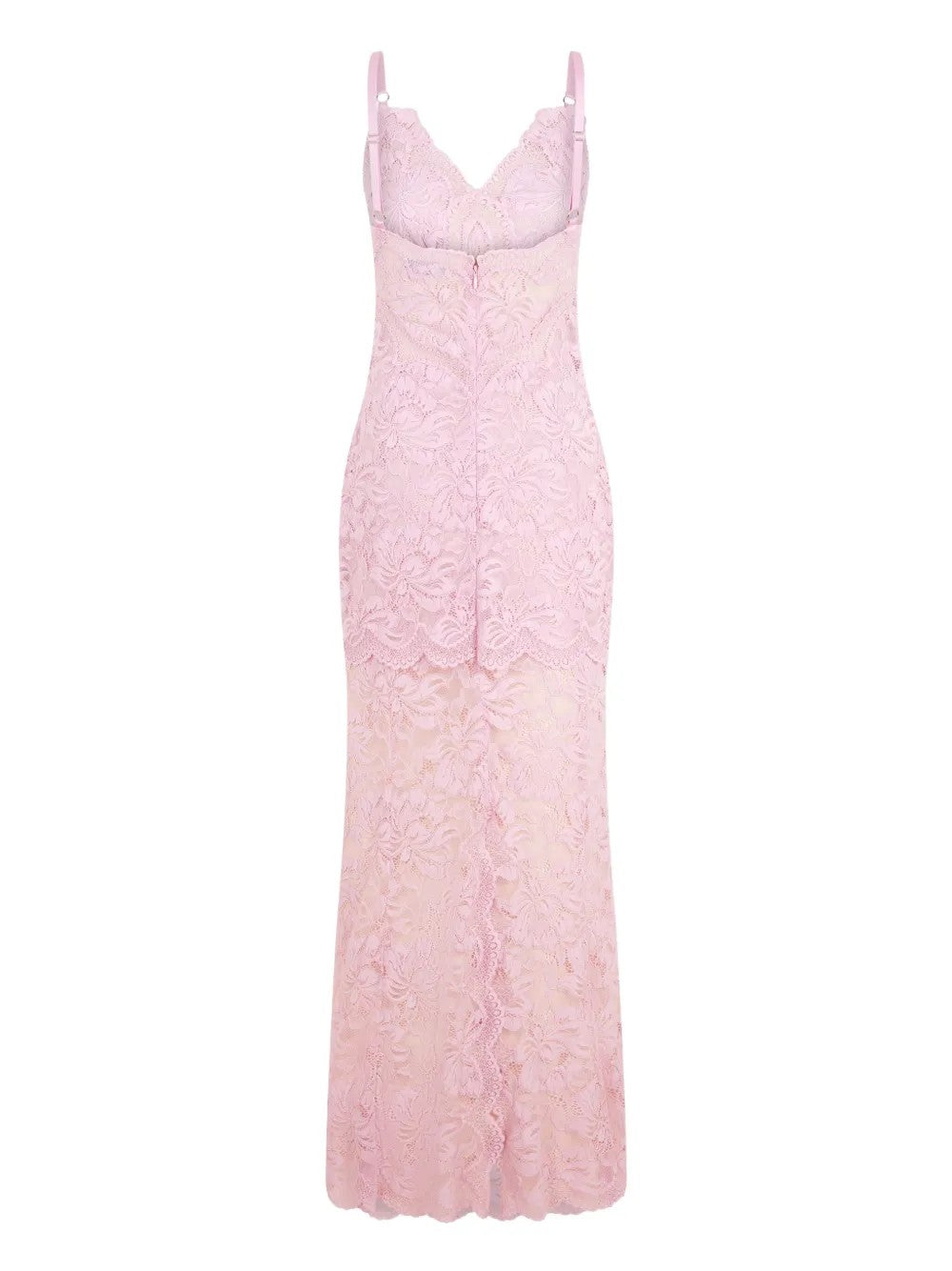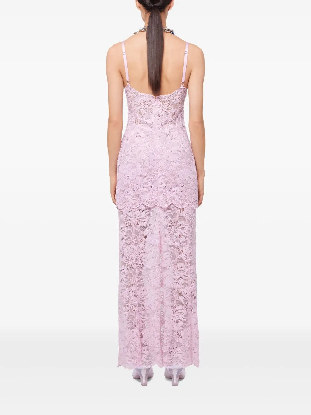 El vestido de encaje rosa claro de Rabanne combina romance y sensualidad con un diseño refinado. Cuenta con tirantes finos ajustables, un escote corpiño que realza tu escote y un cierre de cremallera oculta en la espalda para un acabado impecable. El encaje ligero y transparente se complementa con un dobladillo asimétrico que añade movimiento y carácter al look.