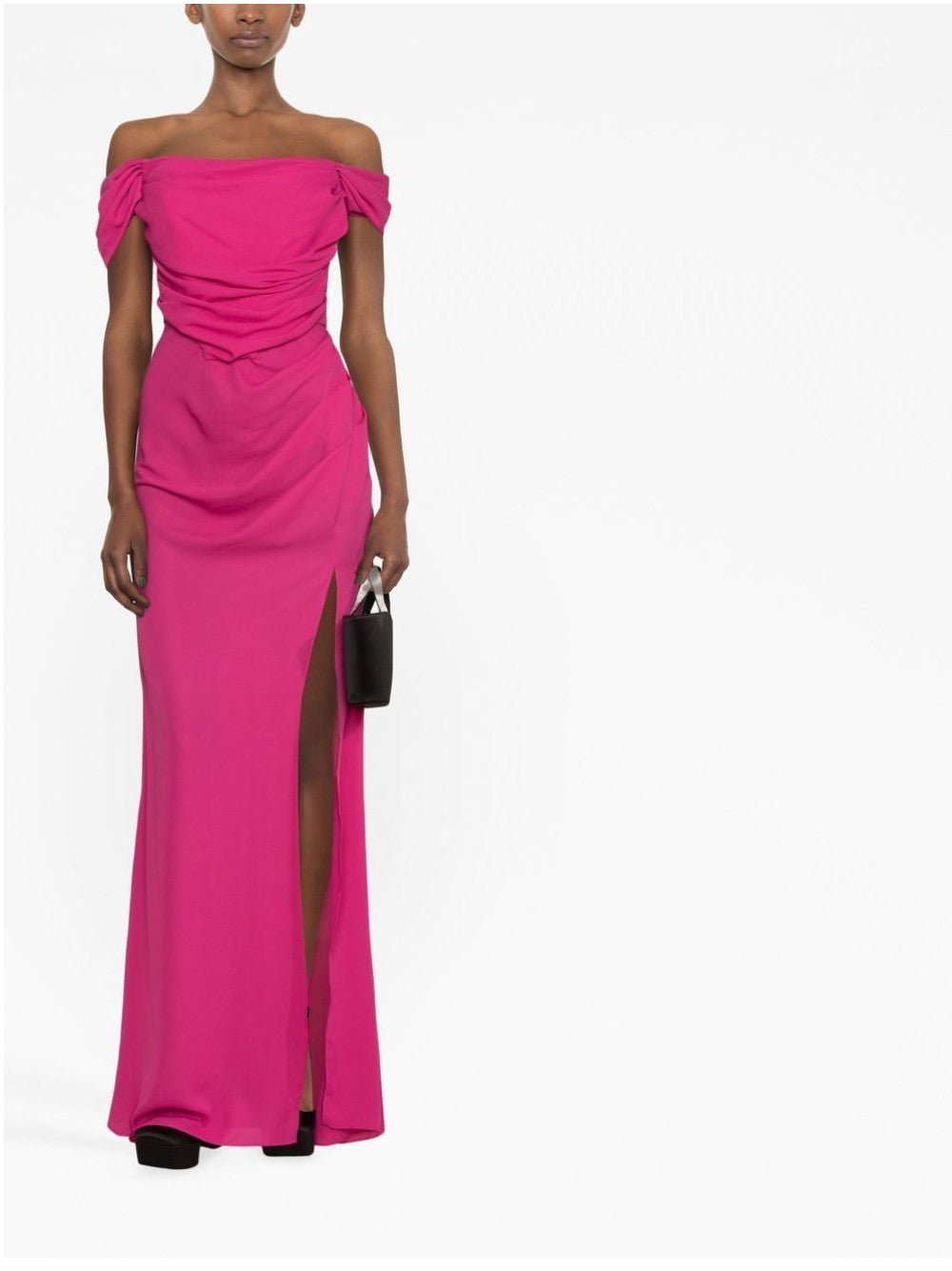Vestido de noche GIUSEPPE DI MORABITO con mangas drapeadas, detalle fruncido, escote cuadrado, maxi aberturas laterales y abertura en la espalda. Cierre con cremallera oculta en la espalda.