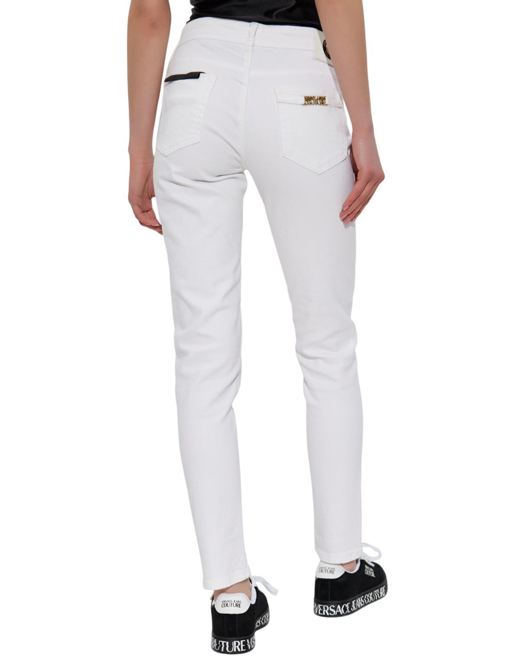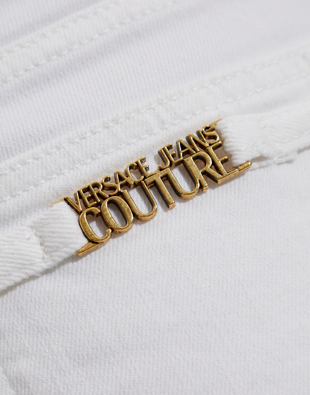 Le jean blanc Versace Jeans Couture est doté d'une fermeture zippée et boutonnée cachée, pour un look élégant et épuré. Le design à cinq poches est pratique et élégant, tandis que les passants de ceinture vous permettent d'ajouter une ceinture. La plaque logo dorée donne une touche luxueuse et distinctive au vêtement.