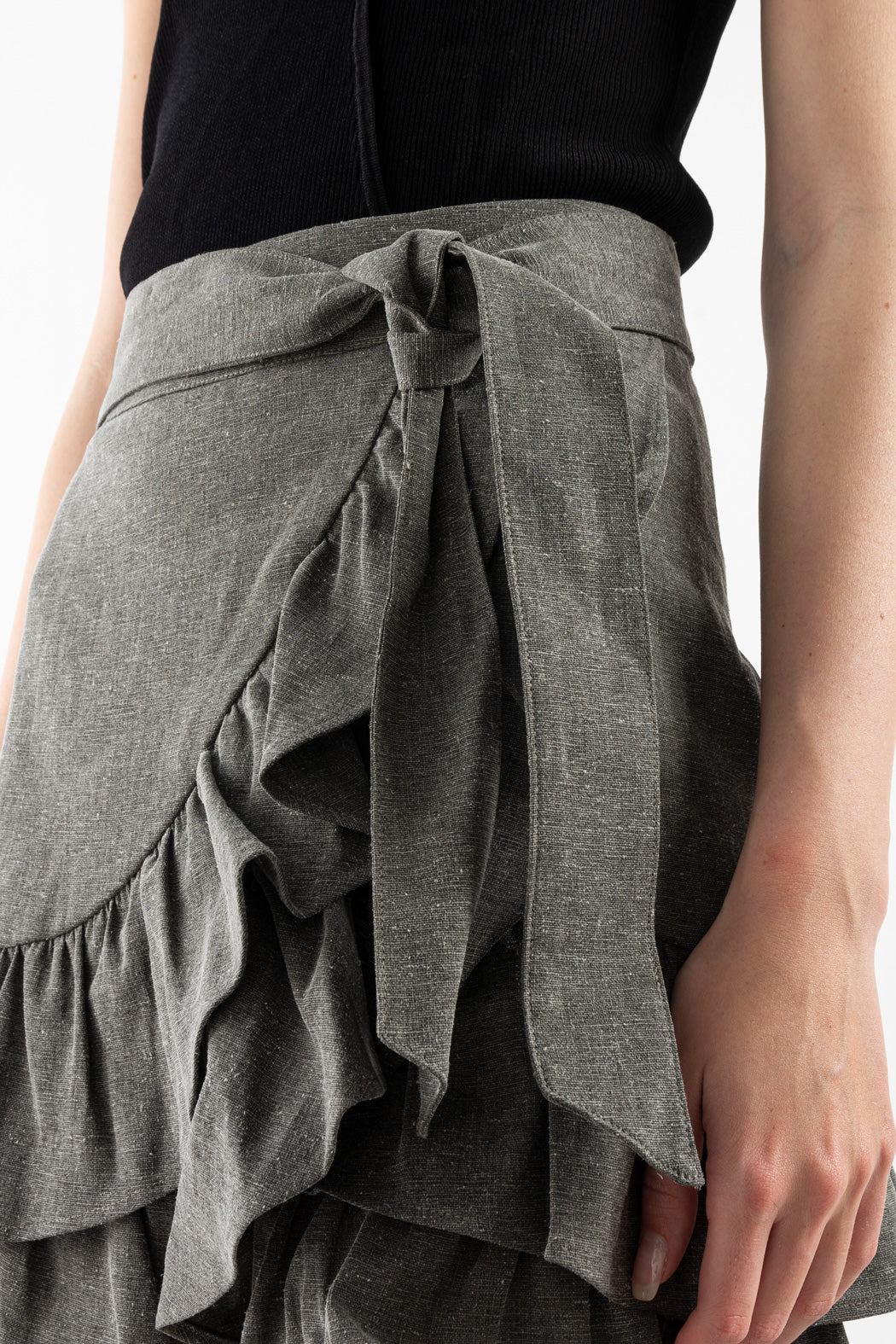 Mini-jupe ROHE en lin mélangé avec volants et ceinture à nouer à la taille. Fermeture zippée invisible sur le côté.