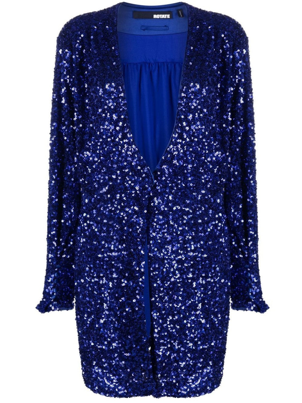 Robe courte portefeuille ROTATE à sequins, col en V et manches longues. Fermeture par ceinture à nouer à la taille.