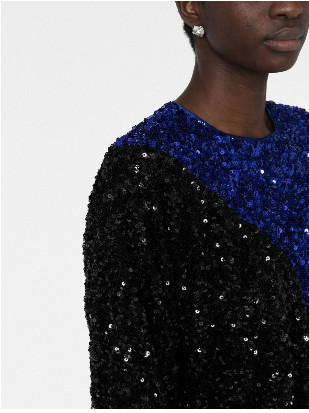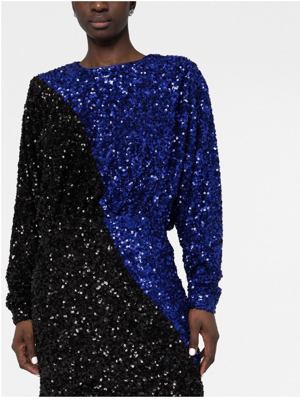 Robe courte ROTATE bicolore avec sequins all-over, col rond et manches longues, taille élastique. Fermeture zippée sur le côté.