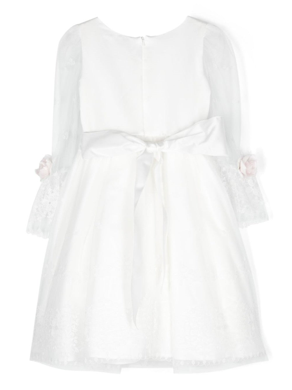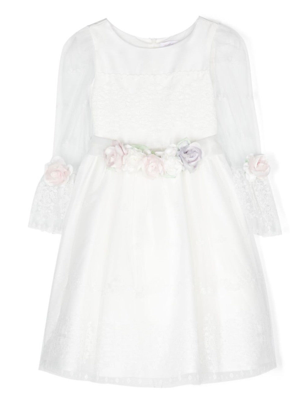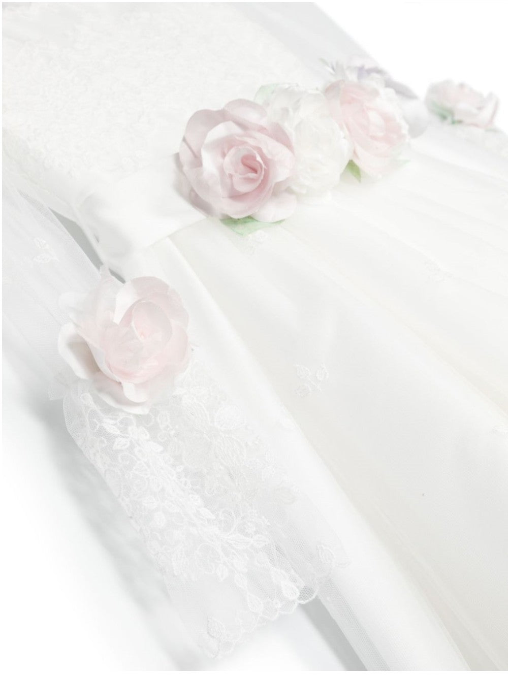 La robe Monnalisa pour filles formelles est un vêtement élégant et raffiné conçu pour les occasions spéciales. Réalisée en tulle avec broderie florale, elle présente une doublure en mousseline et tulle qui donne à la robe une touche aérienne et légère. Les manches en dentelle aux poignets évasés ajoutent un élément romantique et délicat au design général.