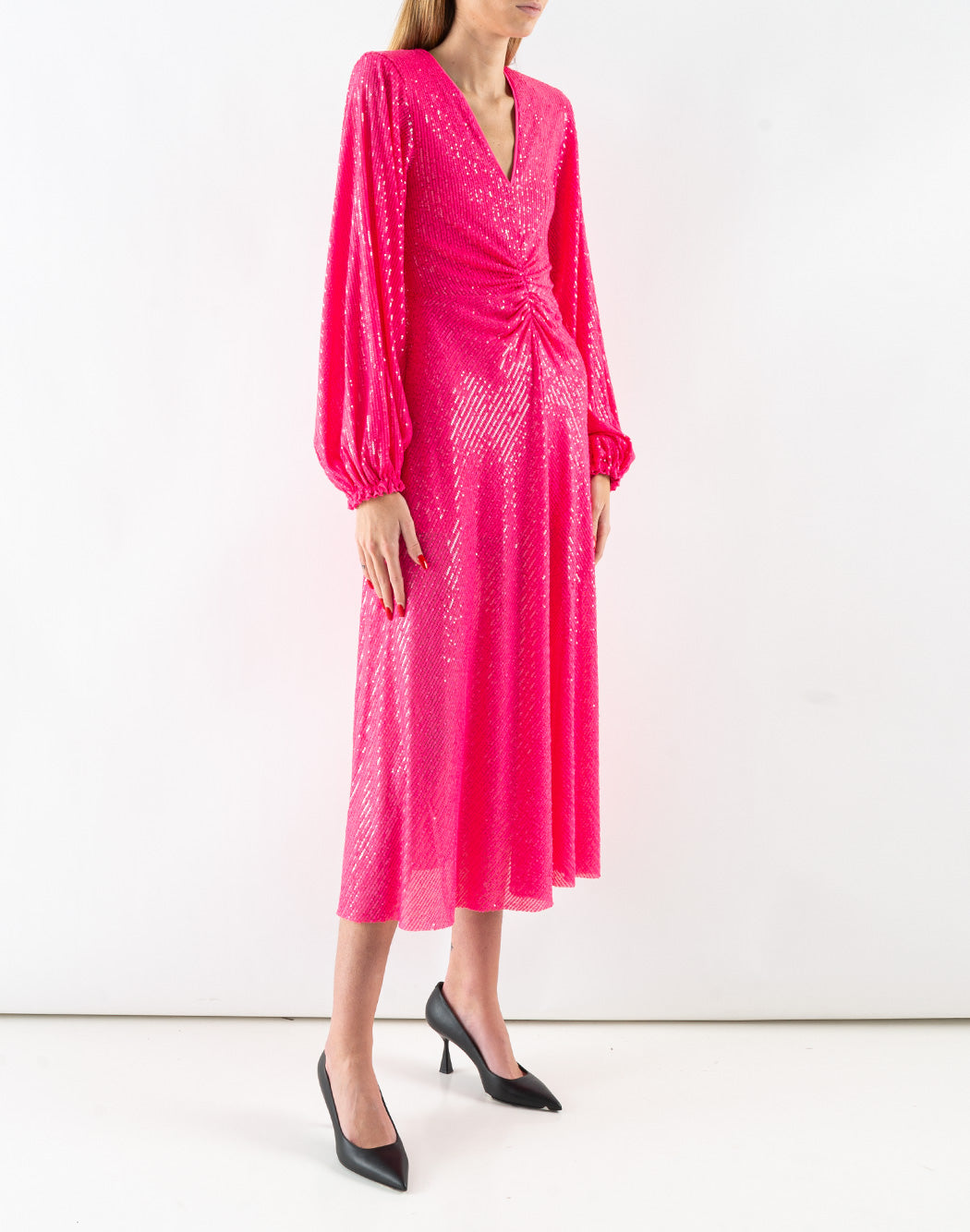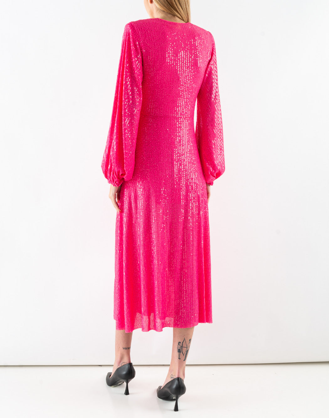 Robe midi ROTATE avec sequins all-over, col en V et manches longues. Fermeture zippée sur le côté.