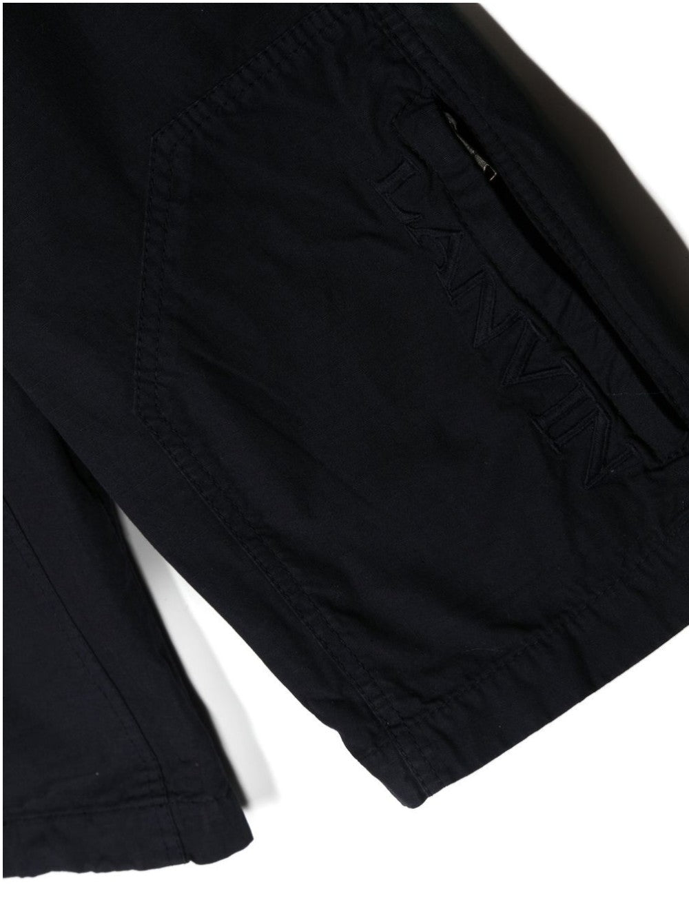 Short LANVIN en coton avec logo brodé ton sur ton, passants de ceinture, fermeture à boucle en forme de D, fermeture cachée sur le devant, deux poches latérales en diagonale, poche passepoilée arrière, poche latérale zippée et coupe droite.