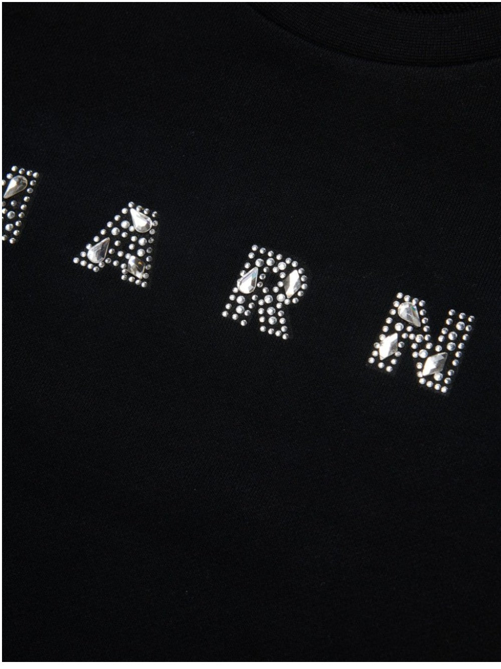 Sweat-shirt court noir en coton brossé, manches longues, avec col rond, poignets et ourlet côtelés. Il est agrémenté d'un logo en strass sur le devant.