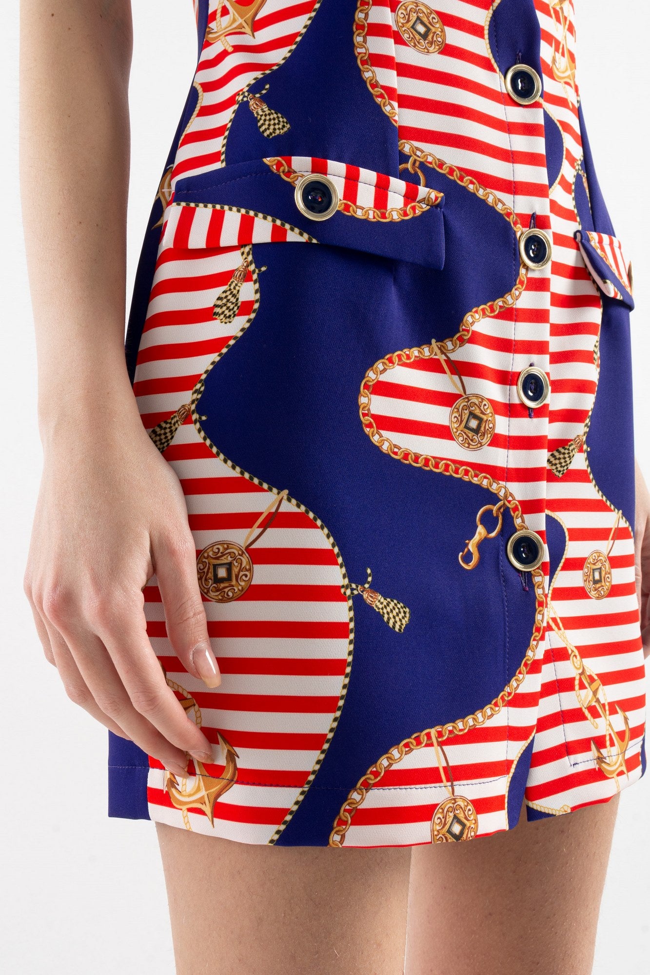 Abito DORIS S con stampa marinara, scollo quadrato. finte tasche frontali, abbottonatura con bottoni a contrasto oro sul davanti.