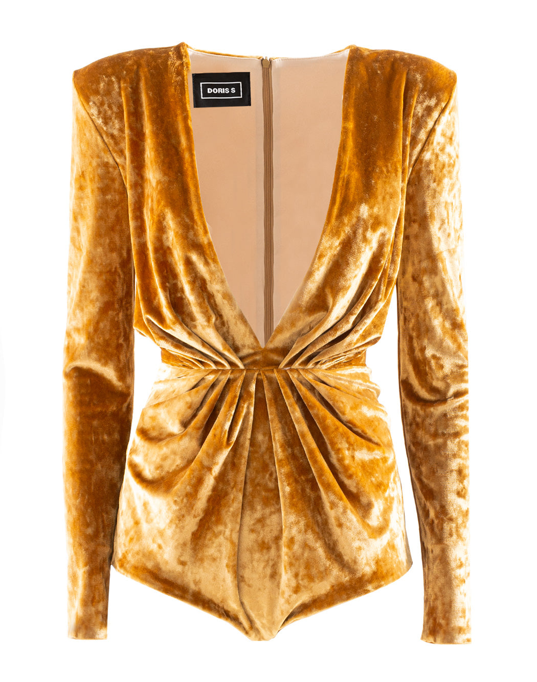 Body DORIS S in velluto con spalline imbottite e scollo profondo a v. Chiusura con cerniera invisibile sul retro.
