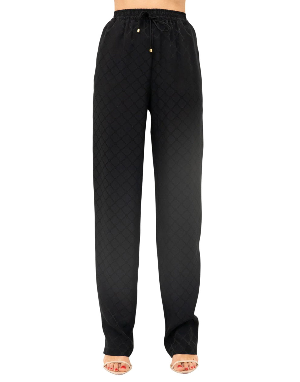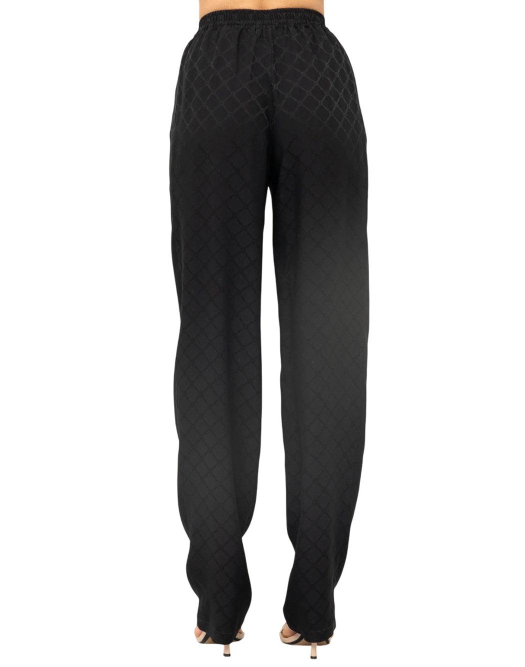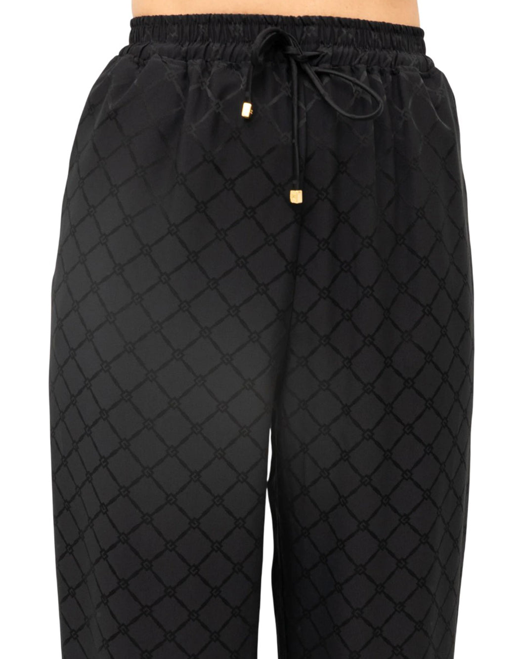 I pantaloni jogger di Elisabetta Franchi sono realizzati in satin con vestibilità regular. Presentano un'elaborata lavorazione jacquard con un motivo a losanghe che dona alla figura una silhouette lineare e luminosa. La vita con elastico e coulisse con lacci assicurano comfort e una vestibilità regolabile. Un capo elegante e moderno, perfetto per uno stile sofisticato ma casual.